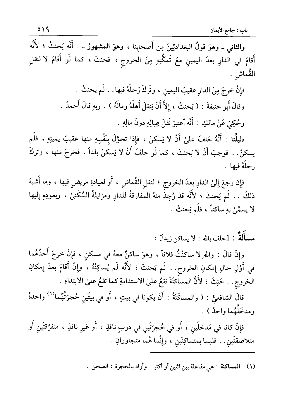 وإن قال: والله لا ساكنت فلانا، وهو ساكن معه في مسكن، فإن خرج أحدهما في أول حال إمكان الخروج.. لم يحنث؛ لأنه لم يساكنه، وإن أقام بعد إمكان الخروج.. حنث؛ لأن المساكنة تقع على الاستدامة كما تقع على الابتداء.