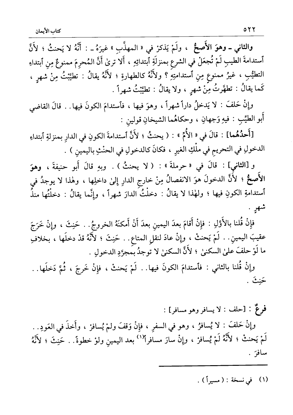 وإن حلف: لا يسافر، وهو في السفر، فإن وقف ولم يسافر، وأخذ في العود.. لم يحنث؛ لأنه لم يسافر، وإن سار مسافرا بعد اليمين ولو خطوة.. حنث؛ لأنه سافر.