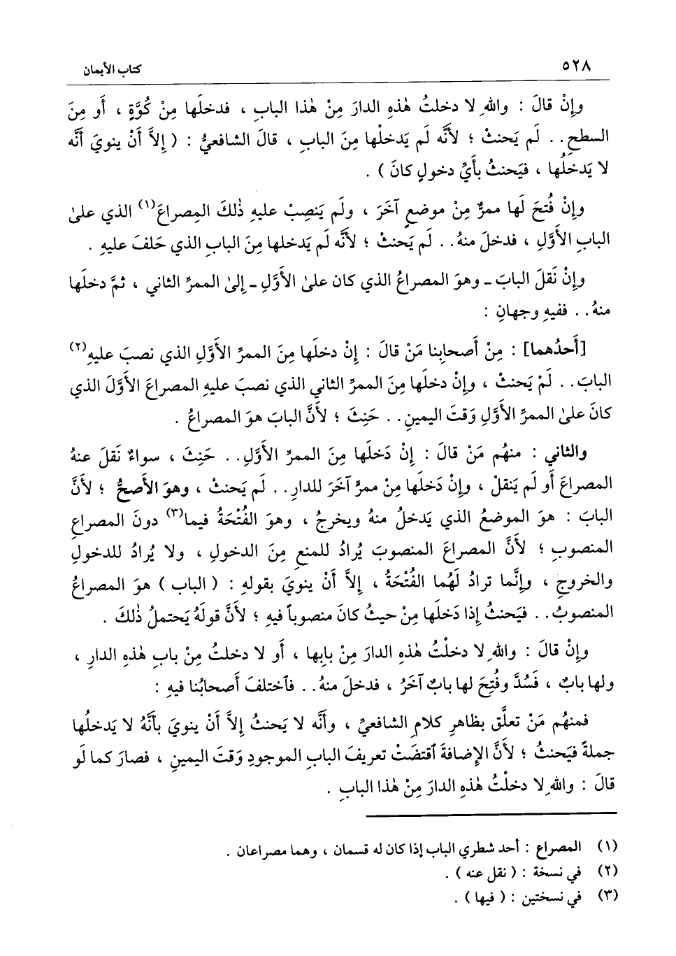 والثاني: منهم من قال: إن دخلها من الممر الأول.. حنث، سواء نقل عنه المصراع أو لم ينقل، وإن دخلها من ممر آخر للدار.. لم يحنث، وهو الأصح؛ لأن الباب: هو الموضع الذي يدخل منه ويخرج، وهو الفتحة فيما دون المصراع المنصوب؛ لأن المصراع المنصوب يراد للمنع من الدخول، ولا يراد للدخول والخروج، وإنما تراد لهما الفتحة، إلا أن ينوي بقوله: (الباب) هو المصراع المنصوب.. فيحنث إذا دخلها من حيث كان منصوبا فيه؛ لأن قوله يحتمل ذلك.