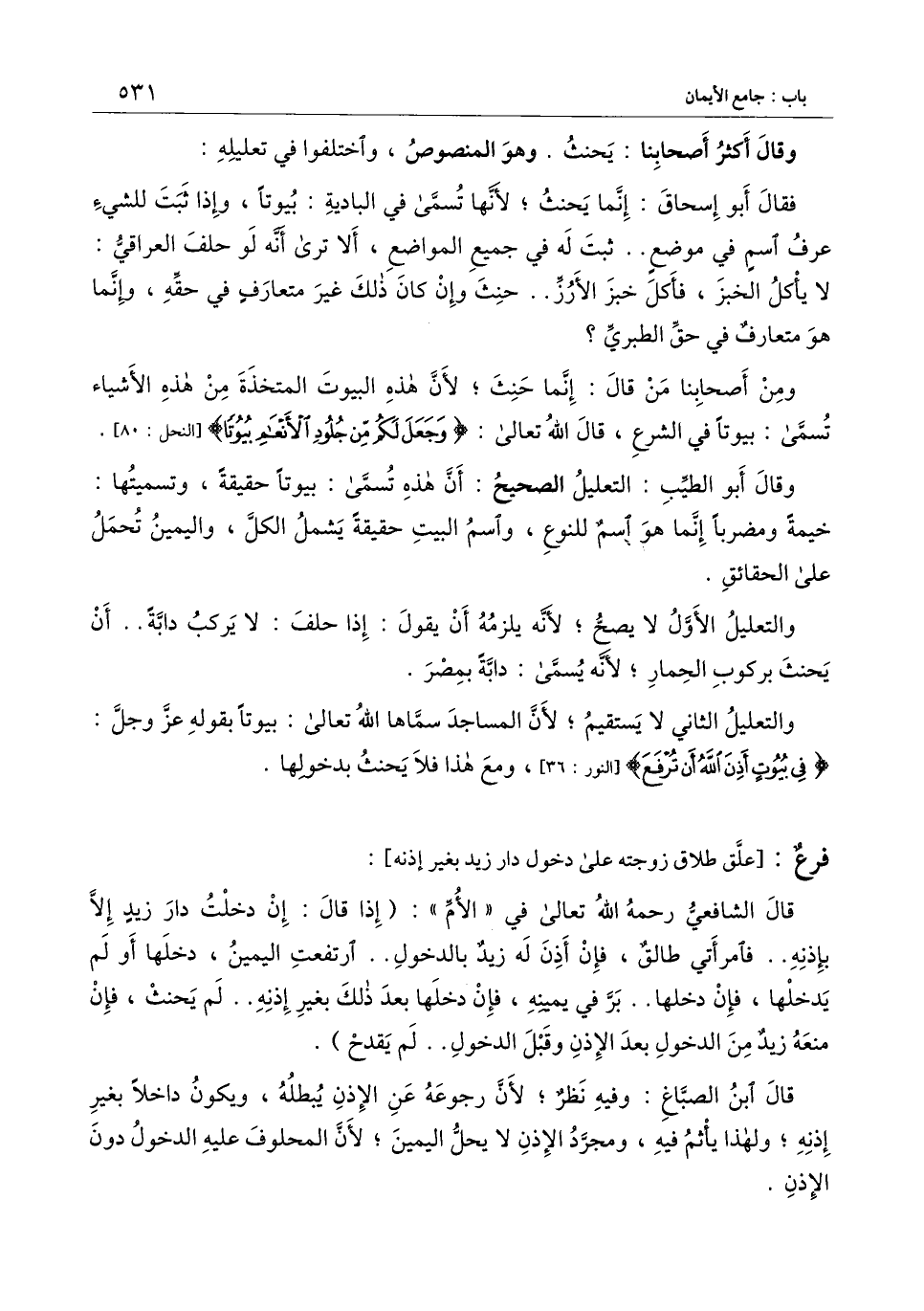 وقال أبو الطيب: التعليل الصحيح: أن هذه تسمى: بيوتا حقيقة، وتسميتها: خيمة ومضربا إنما هو اسم للنوع، واسم البيت حقيقة يشمل الكل، واليمين تحمل على الحقائق.