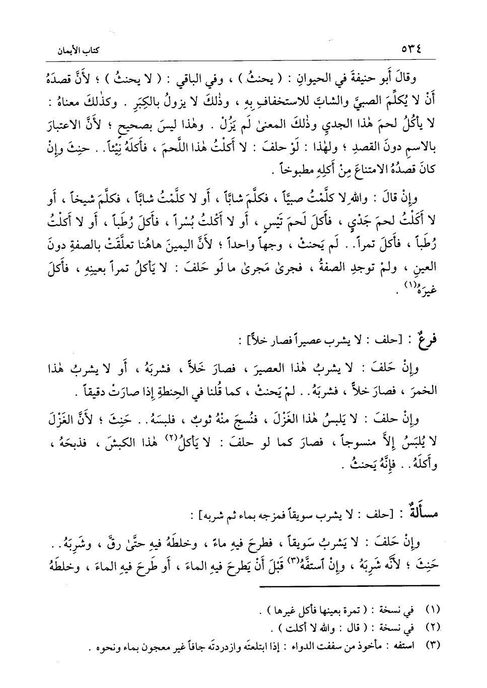 وقال أبو حنيفة في الحيوان: (يحنث) ، وفي الباقي: (لا يحنث) ؛ لأن قصده أن لا يكلم الصبي والشاب للاستخفاف به، وذلك لا يزول بالكبر. وكذلك معناه: لا يأكل لحم هذا الجدي وذلك المعنى لم يزل. وهذا ليس بصحيح؛ لأن الاعتبار بالاسم دون القصد؛ ولهذا: لو حلف: لا أكلت هذا اللحم، فأكله نيئا.. حنث وإن كان قصده الامتناع من أكله مطبوخا.