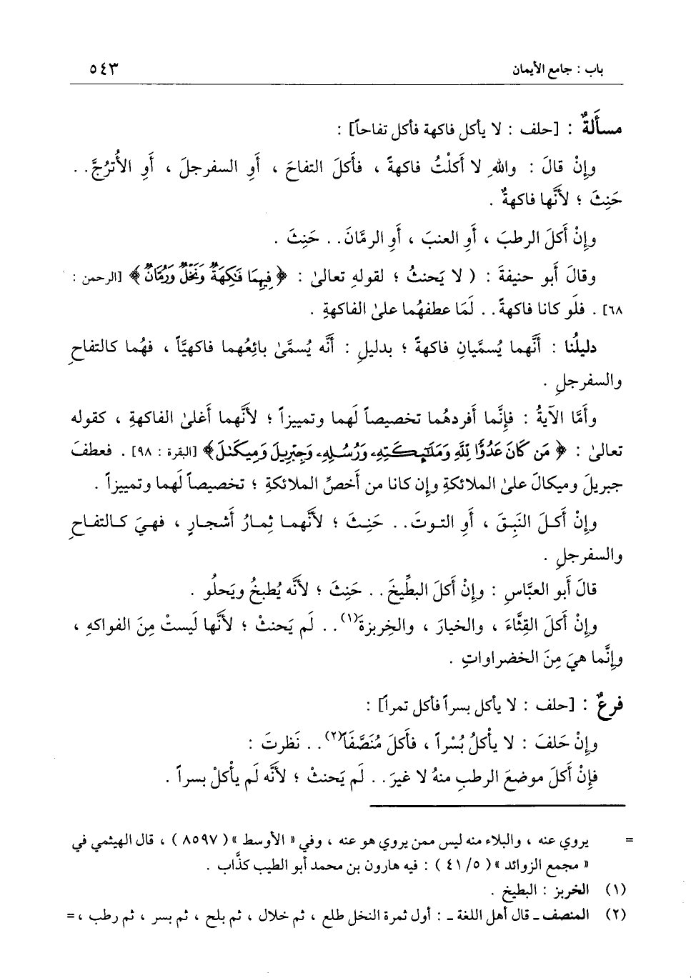 وقال أبو حنيفة: (لا يحنث؛ لِقَوْلِهِ تَعَالَى: {فِيهِمَا فَاكِهَةٌ وَنَخْلٌ وَرُمَّانٌ} [الرحمن: 68] [الرحمن: 68] . فلو كانا فاكهة.. لما عطفهما على الفاكهة.