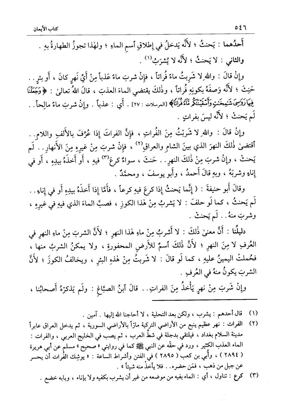 وإن قال: والله لا شربت من الفرات، فإن الفرات إذا عرف بالألف واللام.. اقتضى ذلك النهر الذي بين الشام والعراق، فإن شرب من غيره من الأنهار.. لم يحنث، وإن شرب من ذلك النهر.. حنث، سواء كرع فيه، أو أخذه بيده، أو في إناء وشربه، وبه قال أحمد وأبو يوسف ومحمد.