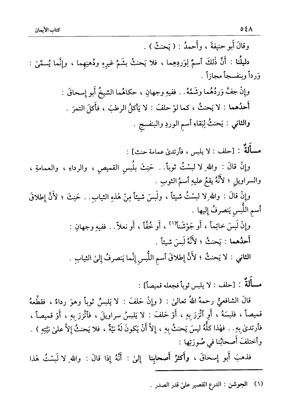 حنث] : وإن قال: والله لا لبست ثوبا.. حنث بلبس القميص والرداء والعمامة والسراويل؛ لأنه يقع عليه اسم الثوب.