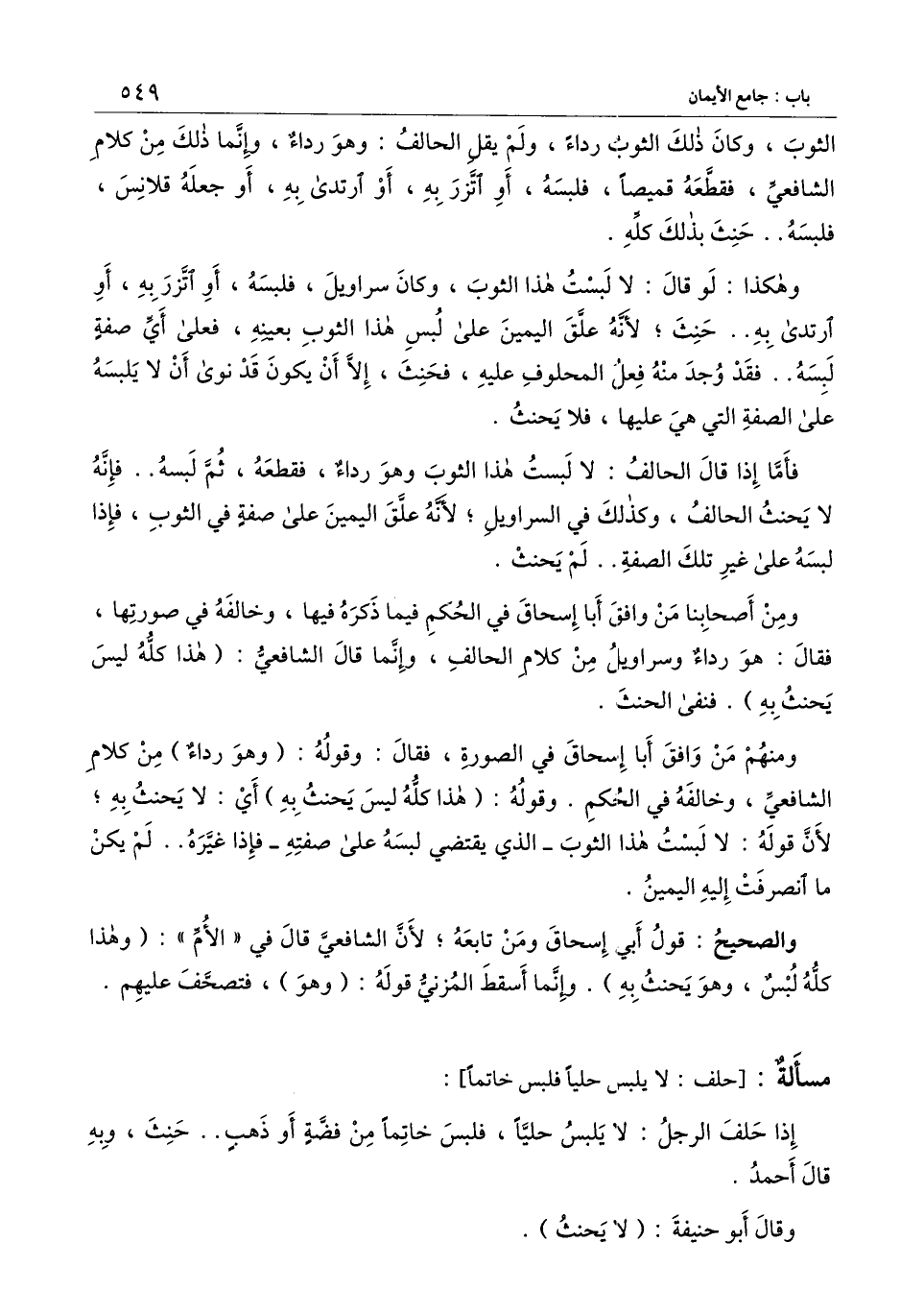 ومنهم من وافق أبا إسحاق في الصورة، فقال: وقوله: (وهو رداء) من كلام الشافعي، وخالفه في الحكم. وقوله: (هذا كله ليس يحنث به) أي: لا يحنث به؛ لأن قوله: لا لبست هذا الثوب - الذي يقتضي لبسه على صفته - فإذا غيره.. لم يكن ما انصرفت إليه اليمين.