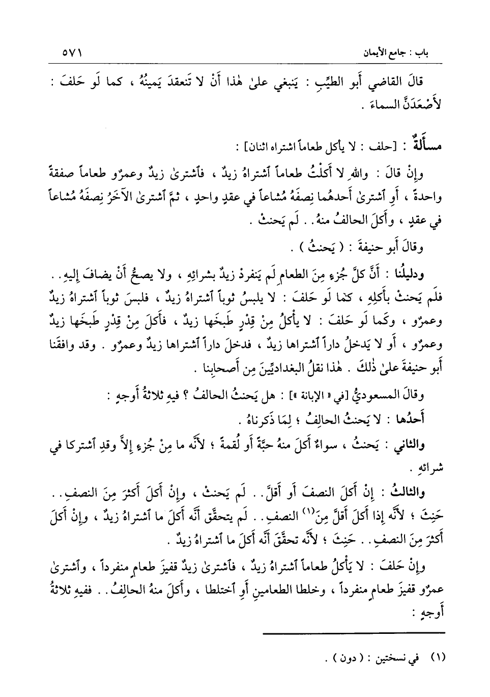 ودليلنا: أن كل جزء من الطعام لم ينفرد زيد بشرائه، ولا يصح أن يضاف إليه.. فلم يحنث بأكله، كما لو حلف: لا يلبس ثوبا اشتراه زيد، فلبس ثوبا اشتراه زيد وعمرو، وكما لو حلف: لا يأكل من قدر طبخها زيد، فأكل من قدر طبخها زيد وعمرو، أو لا يدخل دارا اشتراها زيد، فدخل دارا اشتراها زيد وعمرو. وقد وافقنا أبو حنيفة على ذلك. هذا نقل البغداديين من أصحابنا.