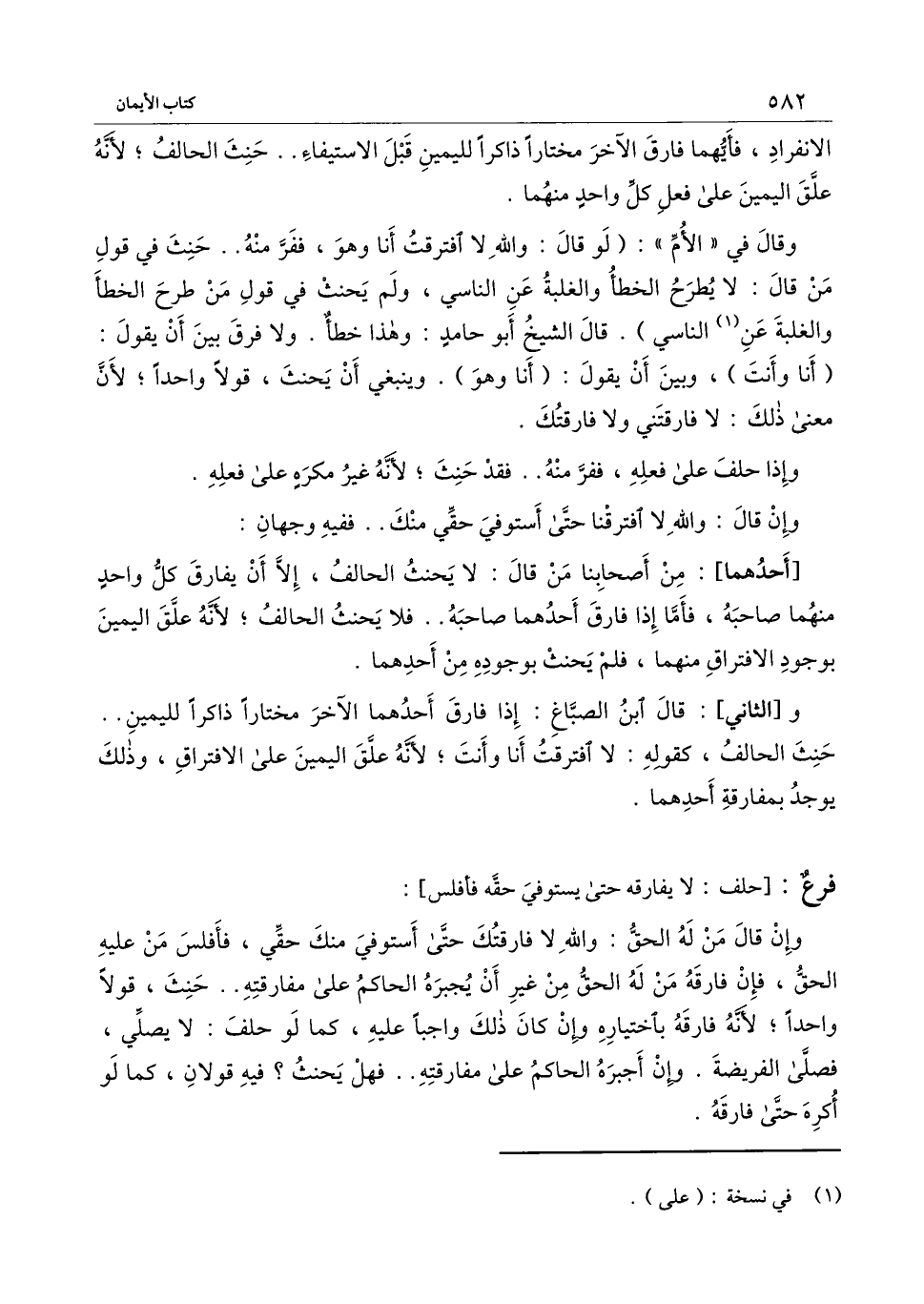 وقال في " الأم ": (لو قال: والله لا افترقت أنا وهو، ففر منه.. حنث في قول من قال: لا يطرح الخطأ والغلبة عن الناسي، ولم يحنث في قول من طرح الخطأ والغلبة عن الناسي) . قال الشيخ أبو حامد: وهذا خطأ. ولا فرق بين أن يقول: (أنا وأنت) ، وبين أن يقول: (أنا وهو) . وينبغي أن يحنث، قولا واحدا؛ لأن معنى ذلك: لا فارقتني ولا فارقتك.
