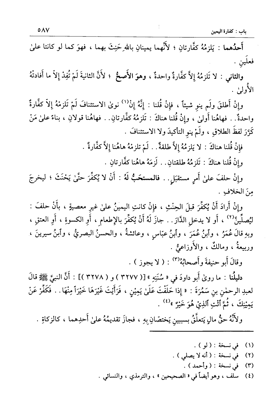 وإن أراد أن يكفر قبل الحنث، فإن كانت اليمين على غير معصية، بأن حلف: ليصلين، أو لا يدخل الدار.. جاز له أن يكفر بالإطعام، أو الكسوة، أو العتق، وبه قال عمر وابن عمر وابن عباس وعائشة والحسن البصري وابن سيرين وربيعة ومالك والأوزاعي.