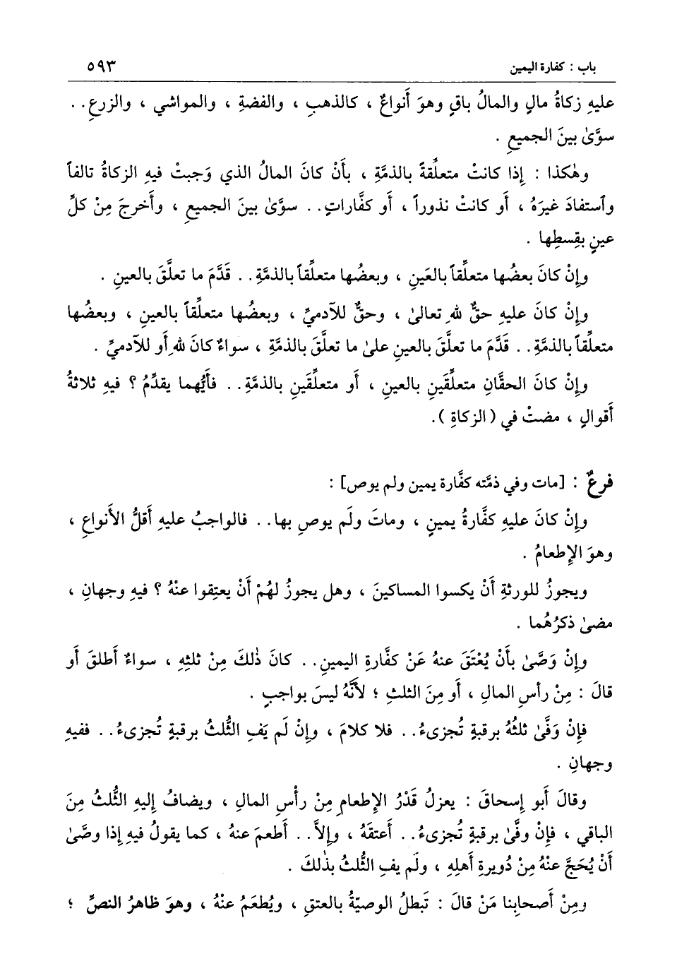 وهكذا إذا كانت متعلقة بالذمة، بأن كان المال الذي وجبت فيه الزكاة تالفا واستفاد غيره، أو كانت نذورا، أو كفارات.. سوى بين الجميع، وأخرج من كل عين بقسطها.
