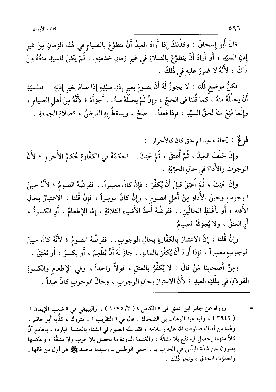 قال أبو إسحاق: وكذلك إذا أراد العبد أن يتطوع بالصيام في هذا الزمان من غير إذن السيد، أو أراد أن يتطوع بالصلاة في غير زمان خدمته.. لم يكن للسيد منعه من ذلك؛ لأنه لا ضرر عليه في ذلك.