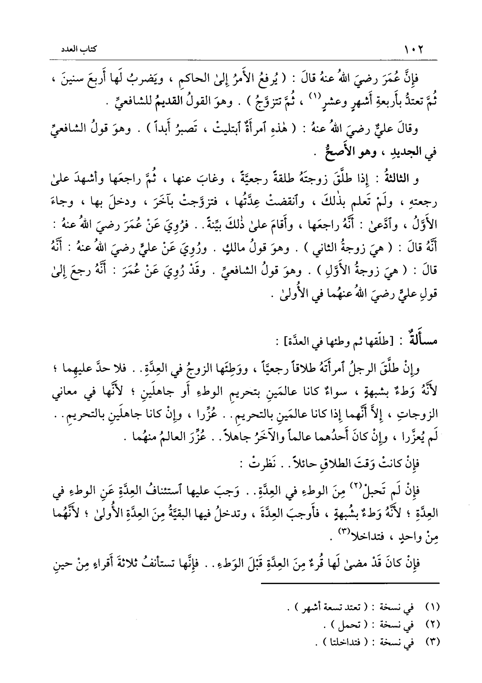 والثالثة: إذا طلق زوجته طلقة رجعية، وغاب عنها، ثم راجعها وأشهد على رجعته، ولم تعلم بذلك، وانقضت عدتها، فتزوجت بآخر، ودخل بها، وجاء الأول، وادعى: أنه راجعها، وأقام على ذلك بينة.. فروي عن عمر - رَضِيَ اللَّهُ عَنْهُ -: أنه قال: (هي زوجة الثاني) . وهو قول مالك. وروي عن علي - رَضِيَ اللَّهُ عَنْهُ -: أنه قال: (هي زوجة الأول) . وهو قول الشافعي. وقد روي عن عمر: أنه رجع إلى قول علي - رَضِيَ اللَّهُ عَنْهُمَا - في الأولى.
