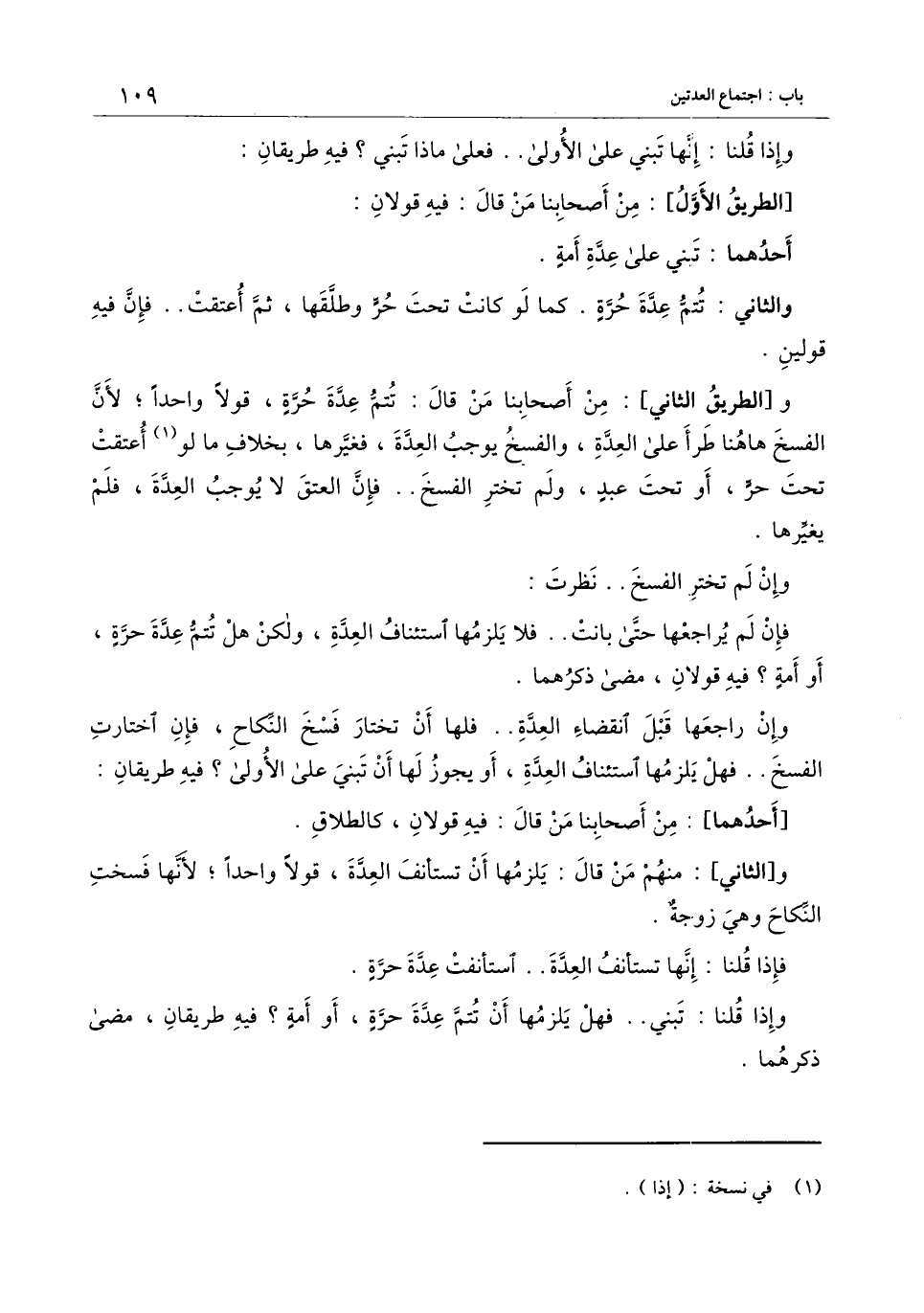 وإذا قلنا: تبني.. فهل يلزمها أن تتم عدة حرة، أو أمة؟ فيه طريقان، مضى ذكرهما.