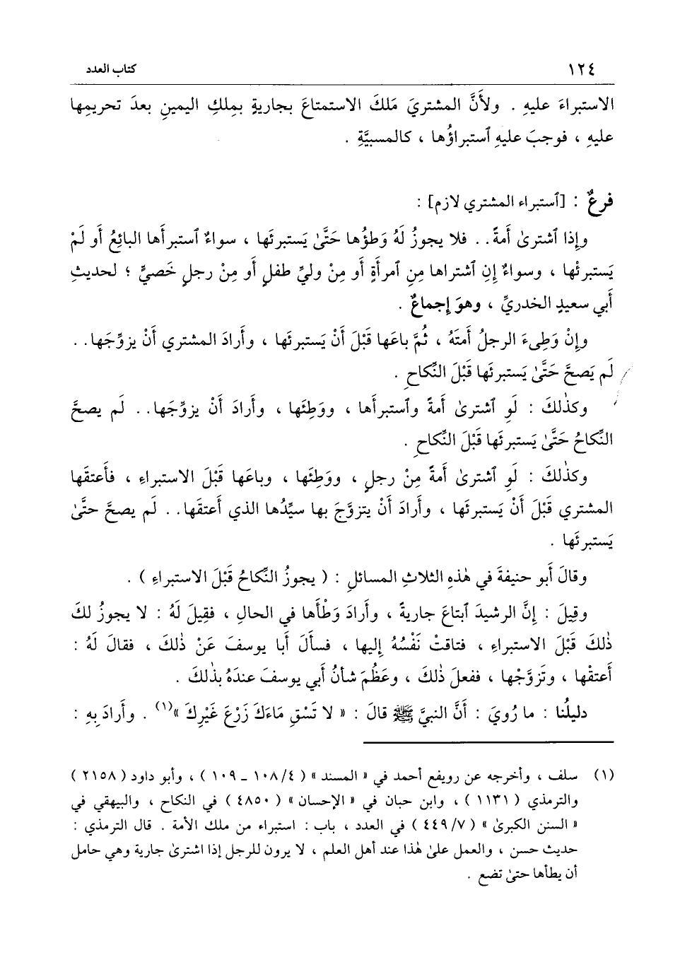 وإذا اشترى أمة.. فلا يجوز له وطؤها حتى يستبرئها، سواء استبرأها البائع أو لم يستبرئها، وسواء إن اشتراها من امرأة أو من ولي طفل أو من رجل خصي؛ لحديث أبي سعيد الخدري، وهو إجماع.