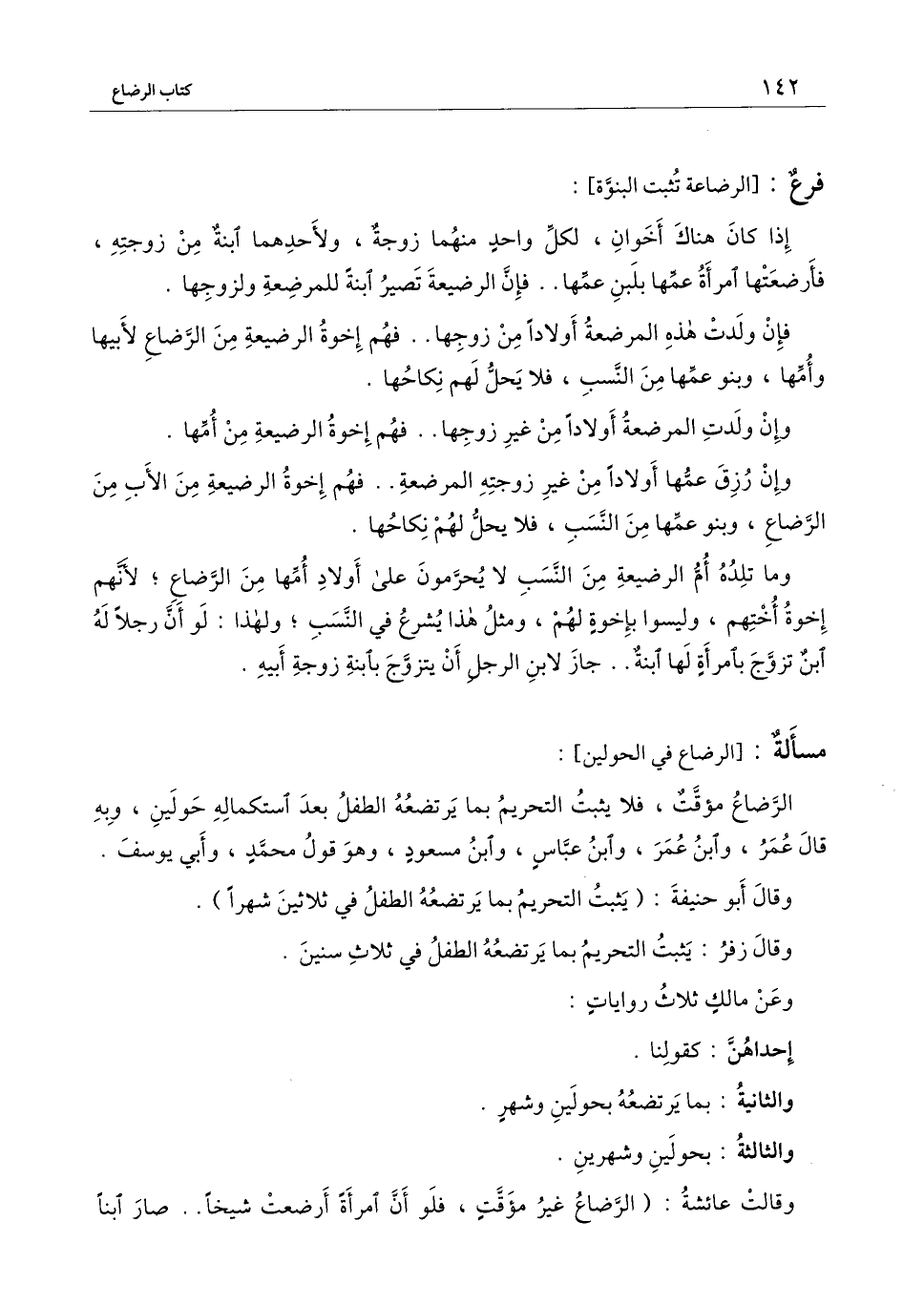 ] : الرضاع مؤقت، فلا يثبت التحريم بما يرتضعه الطفل بعد استكماله حولين، وبه قال عمر، وابن عمر، وابن عباس، وابن مسعود، وهو قول محمد، وأبي يوسف.