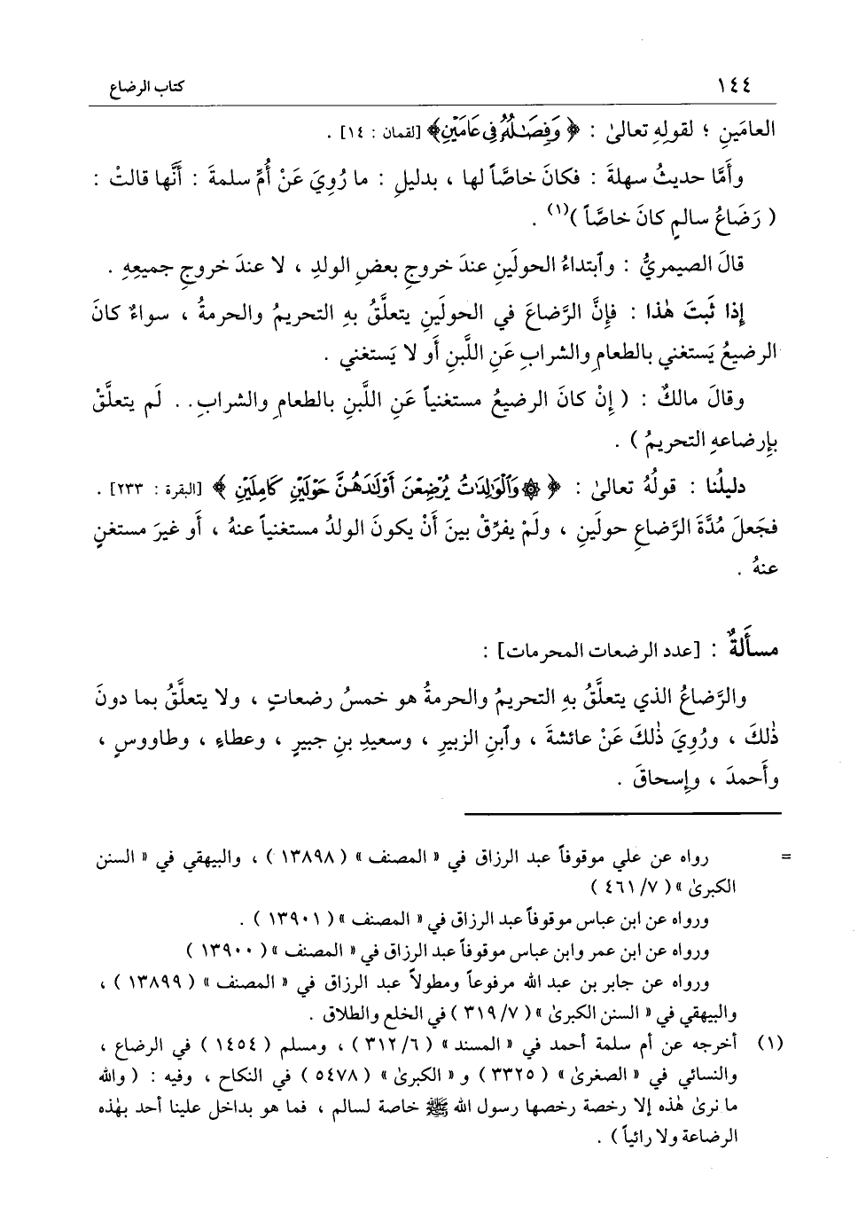 والرضاع الذي يتعلق به التحريم والحرمة هو خمس رضعات، ولا يتعلق بما دون ذلك، وروي ذلك عن عائشة، وابن الزبير، وسعيد بن جبير، وعطاء، وطاووس، وأحمد، وإسحاق.