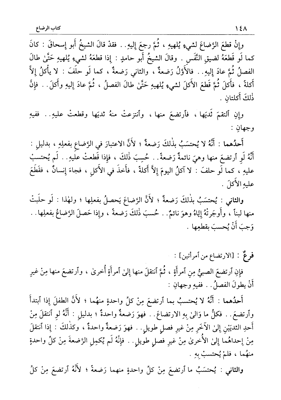 وإن قطع الرضاع لشيء يلهيه، ثم رجع إليه.. فقد قال الشيخ أبو إسحاق: كان كما لو قطعه لضيق النفس. وقال الشيخ أبو حامد: إذا قطعه لشيء يلهيه حتى طال الفصل ثم عاد إليه.. فالأول رضعة، والثاني رضعة، كما لو حلف: لا يأكل إلا أكلة، فأكل ثم قطع الأكل لشيء يلهيه حتى طال الفصل، ثم عاد إليه وأكل.. فإن ذلك أكلتان.