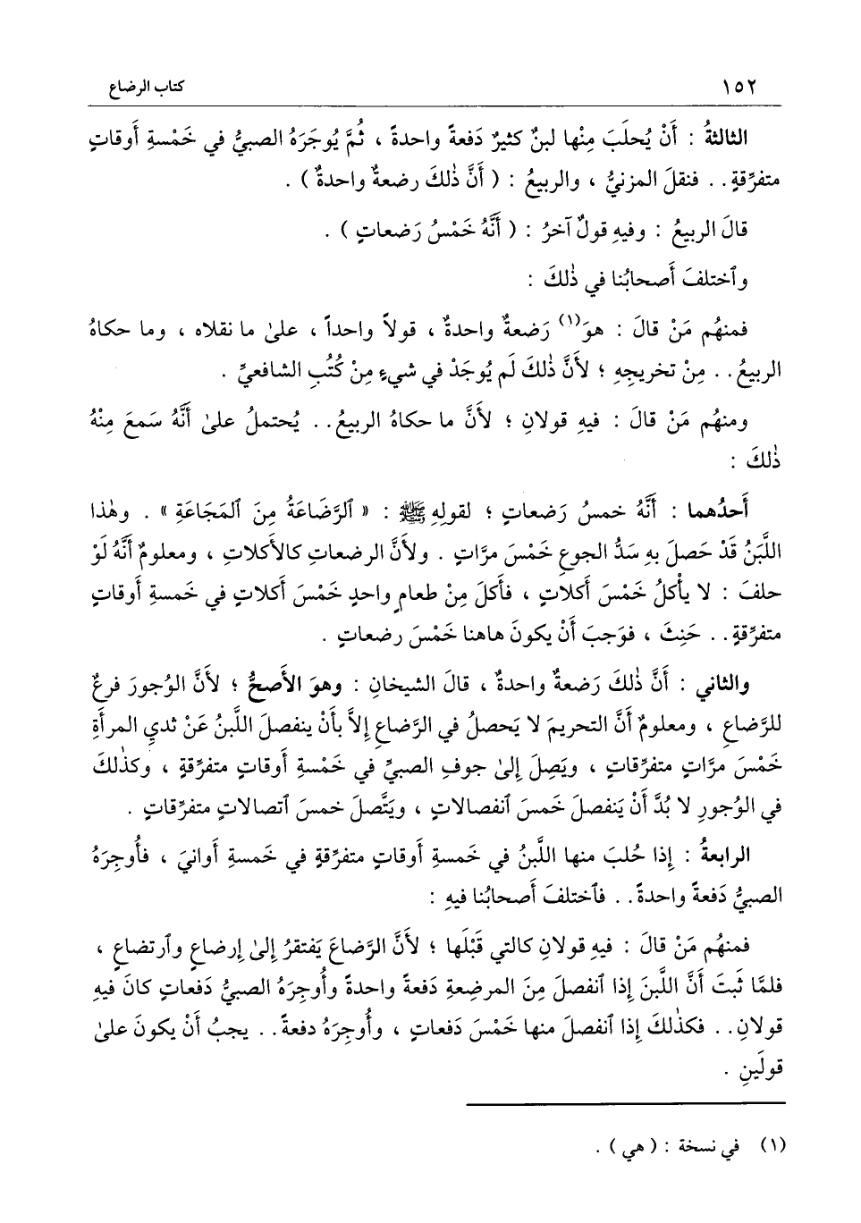 الثالثة: أن يحلب منها لبن كثير دفعة واحدة، ثم يوجره الصبي في خمسة أوقات متفرقة.. فنقل المزني، والربيع: (أن ذلك رضعة واحدة) .