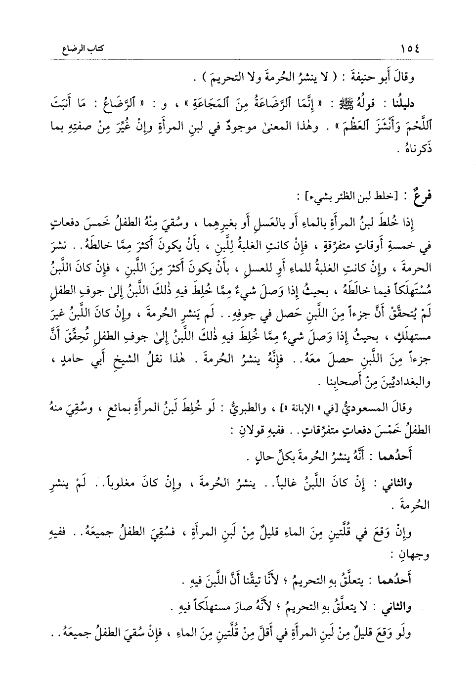 ] : إذا خلط لبن المرأة بالماء أو بالعسل أو بغيرهما، وسقي منه الطفل خمس دفعات في خمسة أوقات متفرقة، فإن كانت الغلبة للبن، بأن يكون أكثر مما خالطه.. نشر الحرمة، وإن كانت الغلة للماء أو للعسل، بأن يكون أكثر من اللبن، فإن كان اللبن مستهلكًا فيما خالطه، بحيث إذا وصل شيء مما خلط فيه ذلك اللبن إلى جوف الطفل لم يتحقق أن جزءًا من اللبن حصل في جوف.. لم ينشر الحرمة، وإن كان اللبن غير مستهلك، بحيث إذا وصل شيء مما خلط فيه ذلك اللبن إلى جوف الطفل تحقق أن جزءًا من اللبن حصل معه.. فإنه ينشر الحرمة. هذا نقل الشيخ أبي حامد، والبغداديين من أصحابنا.