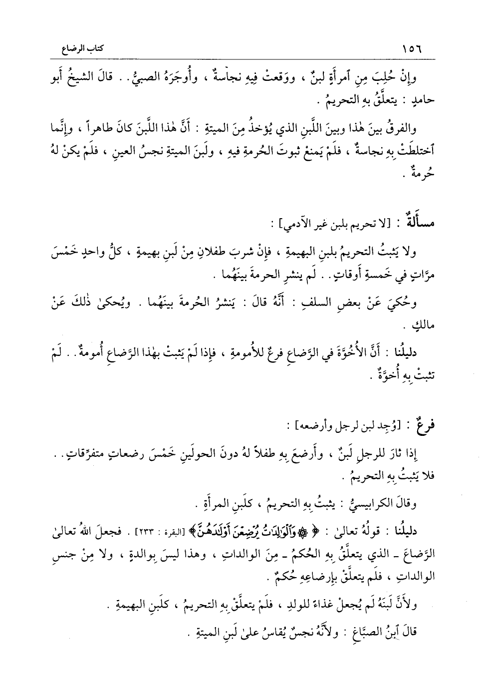 ولا يثبت التحريم بلبن البهيمة، فإن شرب طفلان من لبن بهيمة، كل واحد خمس مرات في خمسة أوقات.. لم ينشر الحرمة بينهما.