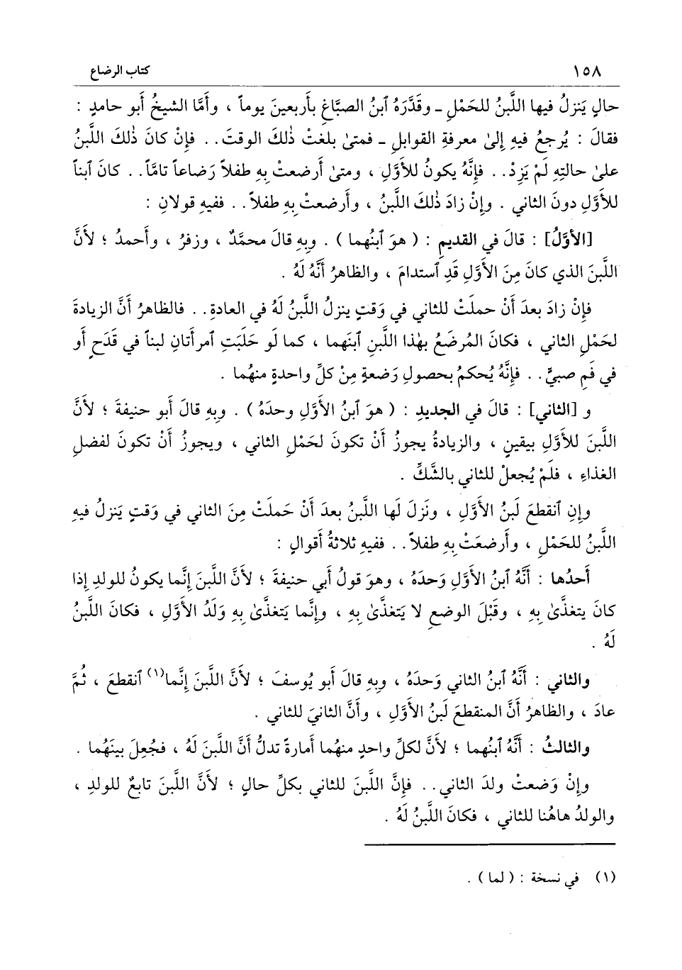 وإن انقطع لبن الأول، ونزل لها اللبن بعد أن حملت من الثاني في وقت ينزل فيه اللبن للحمل، وأرضعت به طفلًا.. ففيه ثلاثة أقوال: