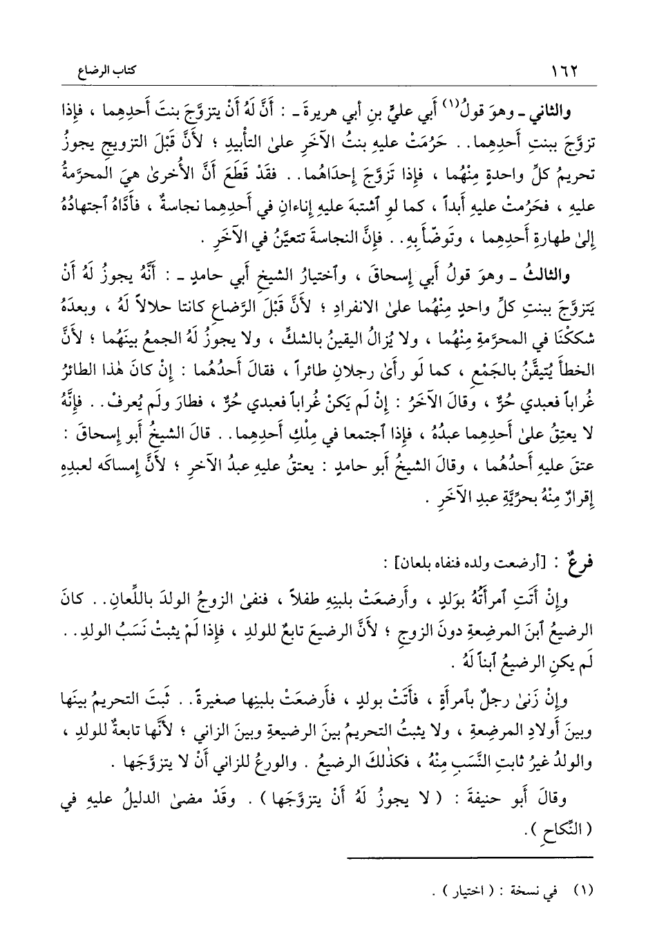والثالث - وهو قول أبي إسحاق، واختيار الشيخ أبي حامد -: أنه يجوز له أن يتزوج ببنت كل واحد منهما على الانفراد؛ لأن قبل الرضاع كانتا حلالًا له، وبعده شككنا في المحرمة منهما، ولا يزال اليقين بالشك، ولا يجوز له الجمع بينهما؛ لأن الخطأ يتيقن بالجمع، كما لو رأى رجلان طائرًا، فقال أحدهما: إن كان هذا الطائر غرابًا فعبدي حر، وقال الآخر: إن لم يكن غرابًا فعبدي حر، فطار ولم يعرف.. فإنه لا يعتق على أحدهما عبده، فإذا اجتمعا في ملك أحدهما.. قال الشيخ أبو إسحاق: عتق عليه أحدهما، وقال الشيخ أبو حامد: يعتق عليه عبد الآخر؛ لأن إمساكه لعبده إقرار منه بحرية عبد الآخر.