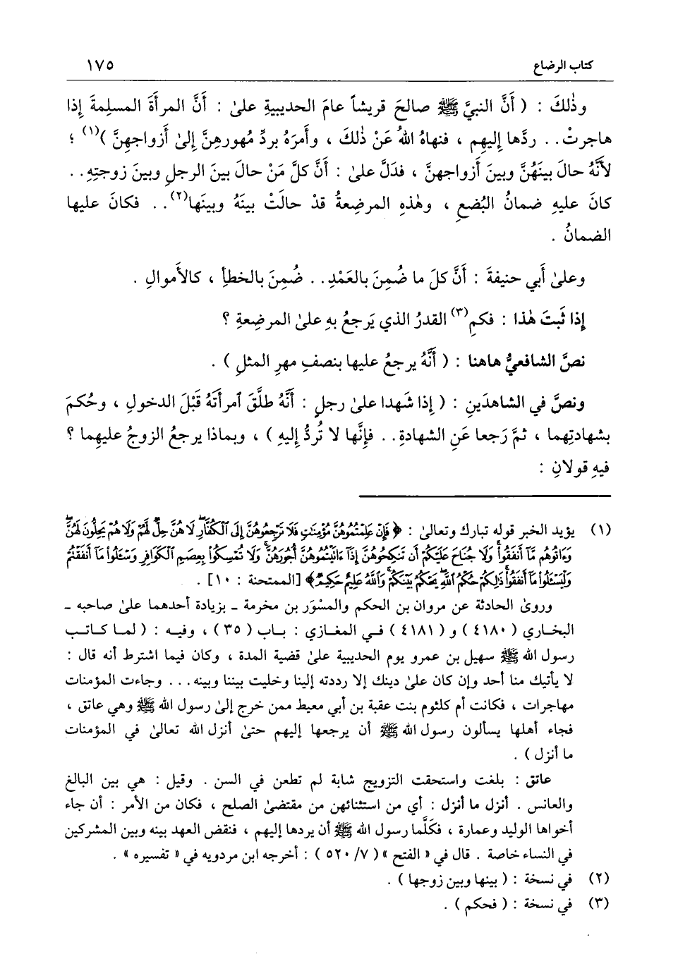وذلك: (أن النبي - صَلَّى اللَّهُ عَلَيْهِ وَسَلَّمَ - صالح قريشًا عام الحديبية على: أن المرأة المسلمة إذا هاجرت.. ردها إليهم، فنهاه الله عن ذلك، وأمره برد مهورهن إلى أزواجهن) ؛ لأنه حال بينهن وبين أزواجهن، فدل على: أن كل من حال بين الرجل وبين زوجته.. كان عليه ضمان البضع، وهذه المرضعة قد حالت بينه وبينها.. فكان عليها الضمان.