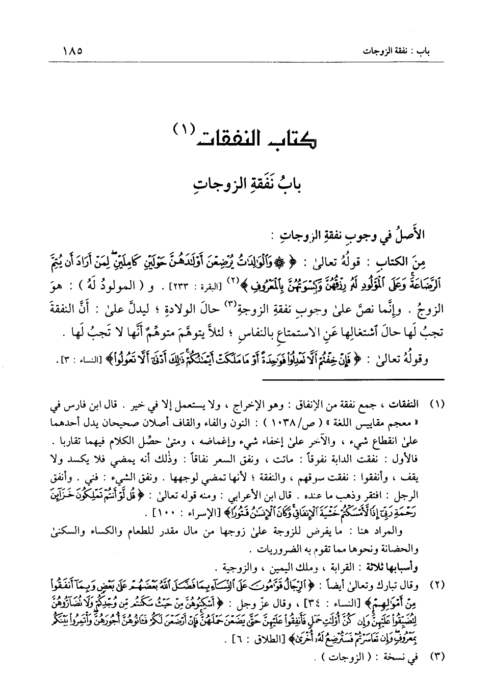 باب نفقة الزوجات الأصل في وجوب نفقة الزوجات: من الكتاب: قَوْله تَعَالَى: {وَالْوَالِدَاتُ يُرْضِعْنَ أَوْلادَهُنَّ حَوْلَيْنِ كَامِلَيْنِ لِمَنْ أَرَادَ أَنْ يُتِمَّ الرَّضَاعَةَ وَعَلَى الْمَوْلُودِ لَهُ رِزْقُهُنَّ وَكِسْوَتُهُنَّ بِالْمَعْرُوفِ} [البقرة: 233] [البقرة: 233] . و (المولود له) : هو الزوج. وإنما نص على وجوب نفقة الزوجة حال الولادة؛ ليدل على: أن النفقة تجب لها حال اشتغالها عن الاستمتاع بالنفاس؛ لئلا يتوهم متوهم أنها لا تجب لها.