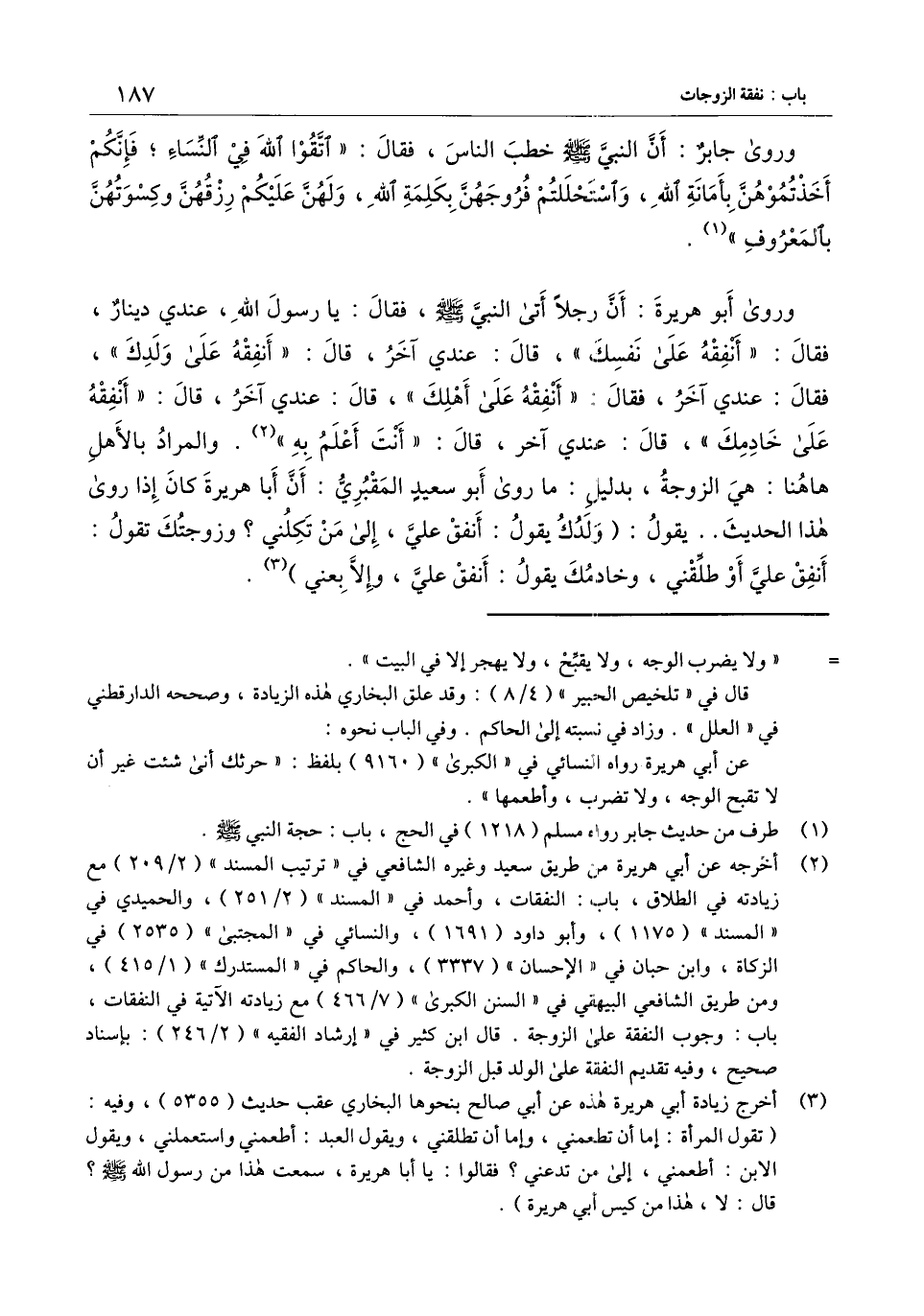 وروى جابر: أن النبي - صَلَّى اللَّهُ عَلَيْهِ وَسَلَّمَ - خطب الناس، فقال: «اتقوا الله في النساء؛ فإنكم أخذتموهن بأمانة الله، واستحللتم فروجهن بكلمة الله، ولهن عليكم رزقهن وكسوتهن بالمعروف» .