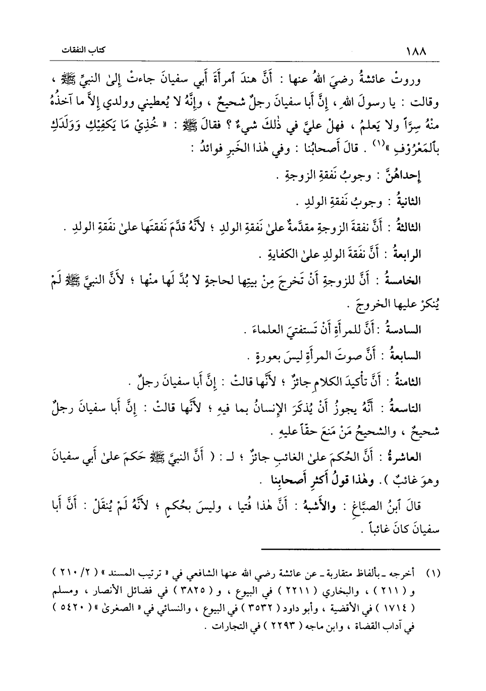 وروت عائشة - رَضِيَ اللَّهُ عَنْهَا -: «أن هند امرأة أبي سفيان جاءت إلى النبي - صَلَّى اللَّهُ عَلَيْهِ وَسَلَّمَ -، وقالت: يا رسول الله، إن أبا سفيان رجل شحيح، وإنه لا يعطيني وولدي إلا ما آخذه منه سرًا ولا يعلم، فهل علي في ذلك شيء؟ فقال - صَلَّى اللَّهُ عَلَيْهِ وَسَلَّمَ -: خذي ما يكفيك وولدك بالمعروف» قال أصحابنا: وفي هذا الخبر فوائد: