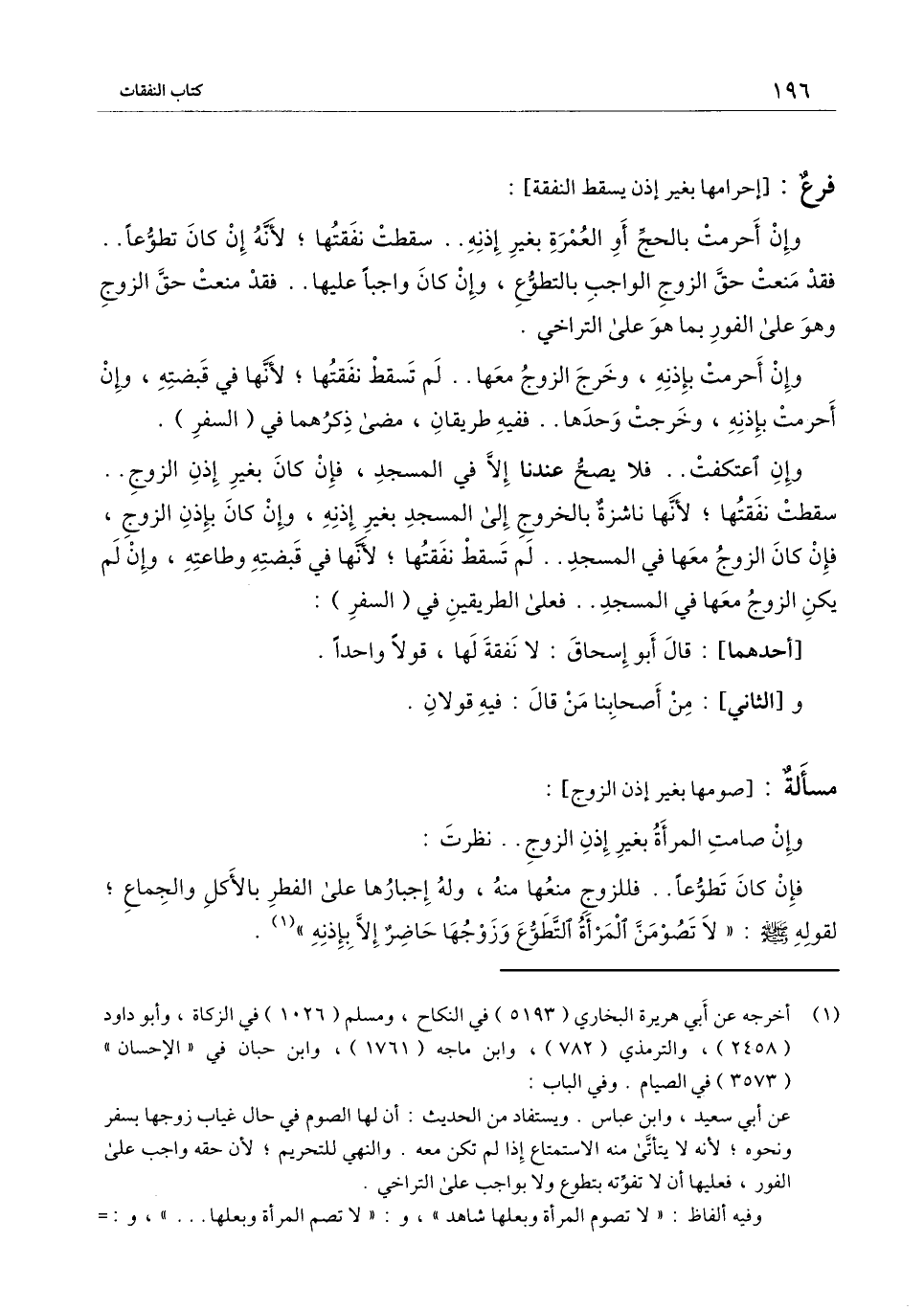 وإن أحرمت بالحج أو العمرة بغير إذنه.. سقطت نفقتها؛ لأنه إن كان تطوعًا.. فقد منعت حق الزوج الواجب بالتطوع، وإن كان واجبًا عليها.. فقد منعت حق الزوج وهو على الفور بما هو على التراخي.