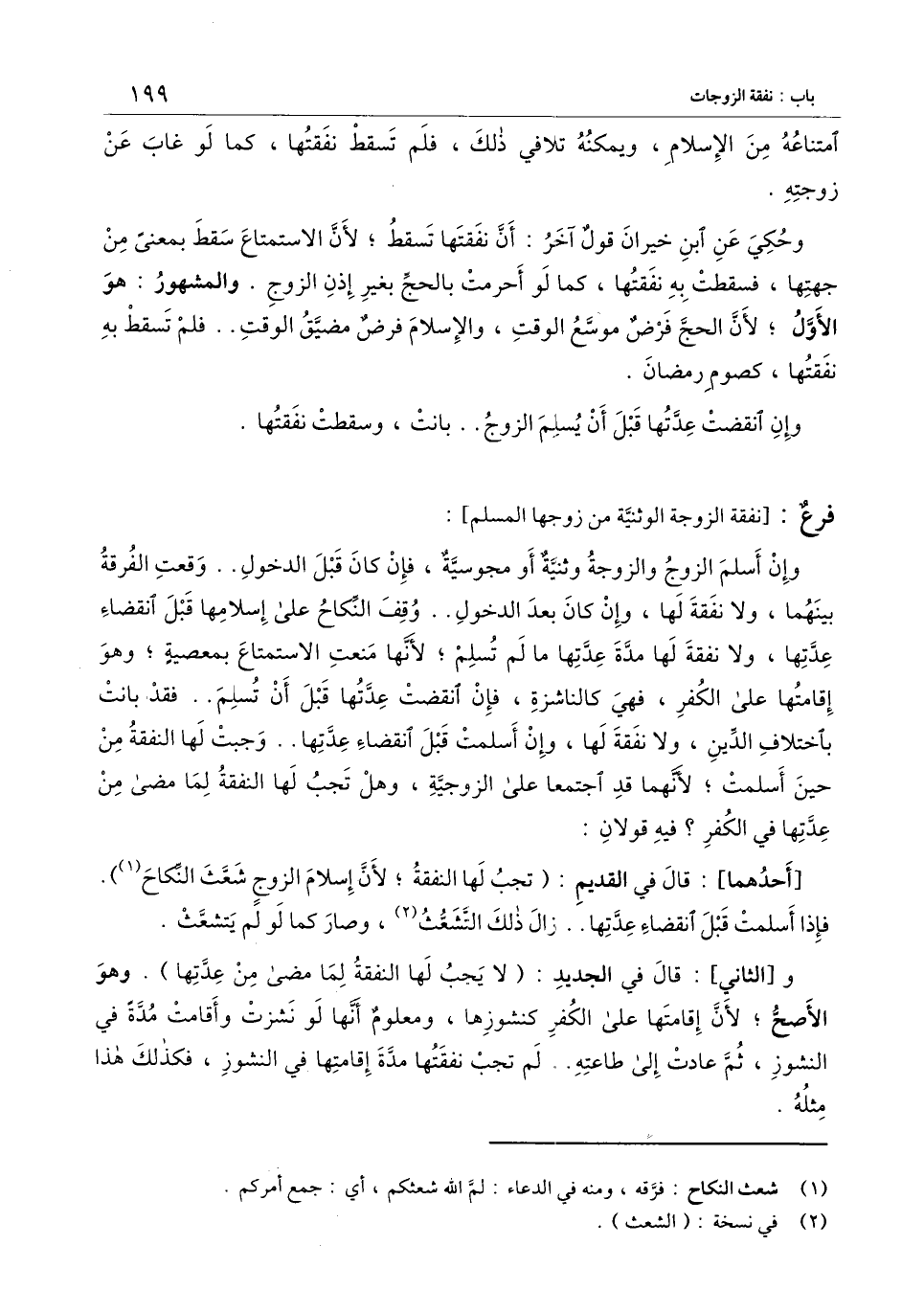 وحكي عن ابن خيران قول آخر: أن نفقتها تسقط؛ لأن الاستمتاع سقط بمعنى من جهتها، فسقطت به نفقتها، كما لو أحرمت بالحج بغير إذن الزوج والمشهور: هو الأول؛ لأن الحج فرض موسع الوقت، والإسلام فرض مضيق الوقت.. فلم تسقط به نفقتها، كصوم رمضان.