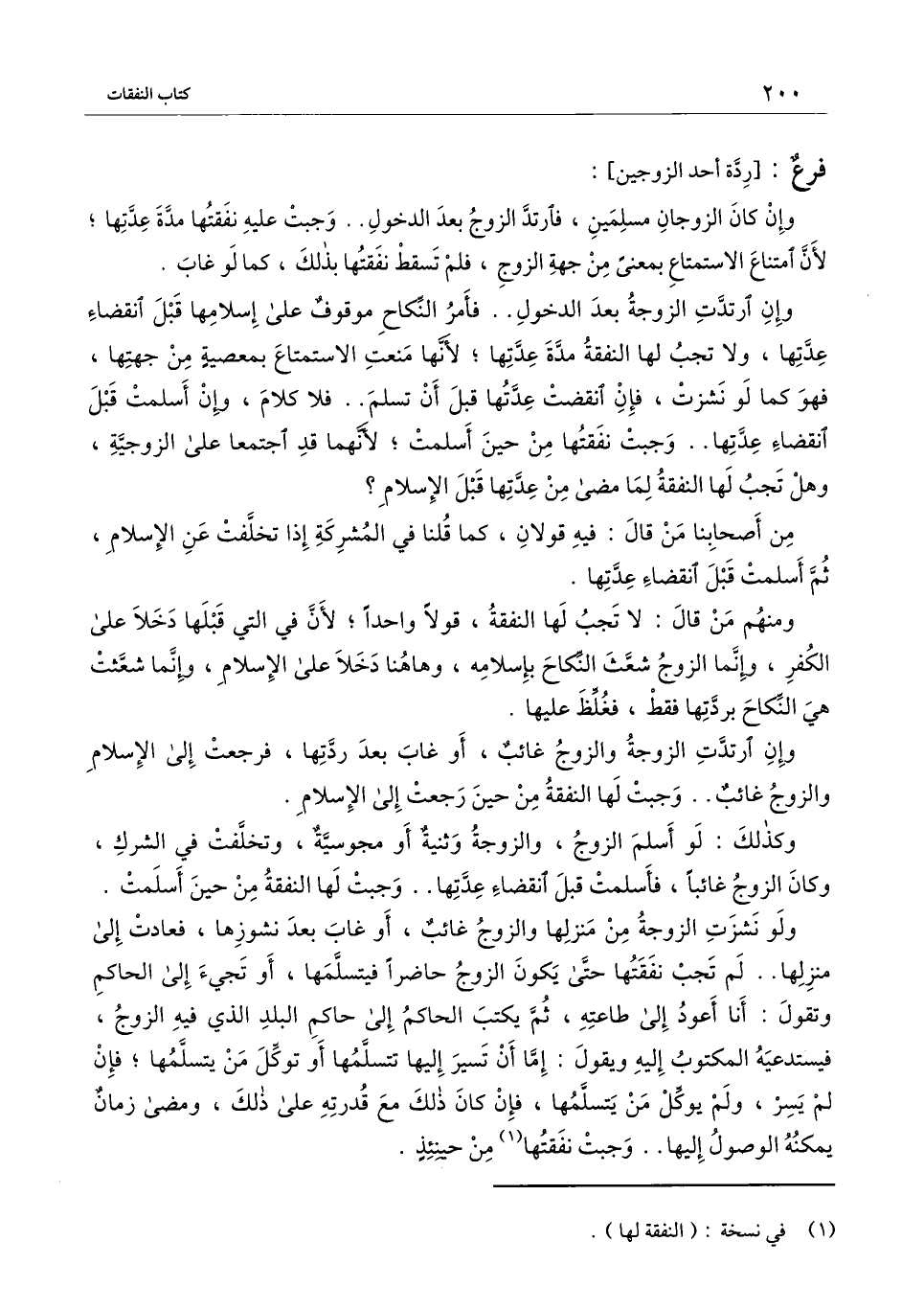 ومنهم من قال: لا تجب لها النفقة، قولًا واحدًا؛ لأن في التي قبلها دخلا على الكفر، وإنما الزوج شعث النكاح بإسلامه، وهاهنا دخلا على الإسلام، وإنما شعثت هي النكاح بردتها فقط، فغلظ عليها.