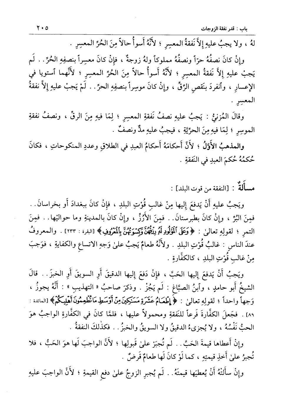 ] : ويجب عليه أن يدفع إليها من غالب قوت البلد، فإن كان ببغداد أو بخراسان.. فمن البر، وإن كان بطبرستان.. فمن الأرز، وإن كان بالمدينة وما حواليها.. فمن التمر؛ لِقَوْلِهِ تَعَالَى: {وَعَلَى الْمَوْلُودِ لَهُ رِزْقُهُنَّ وَكِسْوَتُهُنَّ بِالْمَعْرُوفِ} [البقرة: 233] [البقرة: 233] ، والمعروف عند الناس: غالب قوت البلد. ولأنه طعام يجب على وجه الاتساع والكفاية، فوجب من غالب قوت البلد، كالكفارة.