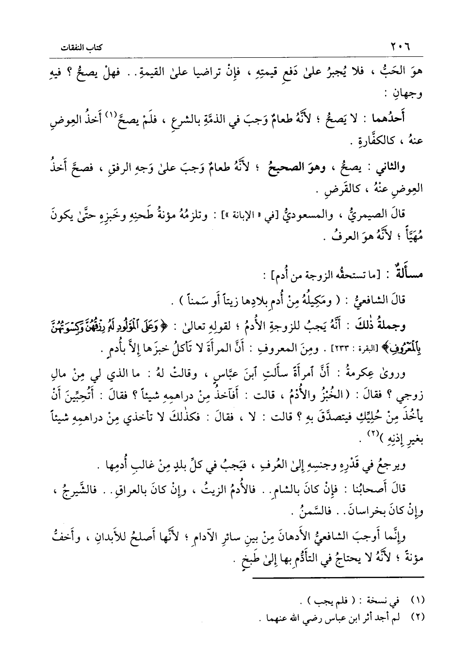 وجملة ذلك: أنه يجب للزوجة الأدم؛ لِقَوْلِهِ تَعَالَى {وَعَلَى الْمَوْلُودِ لَهُ رِزْقُهُنَّ وَكِسْوَتُهُنَّ بِالْمَعْرُوفِ} [البقرة: 233] [البقرة: 233] ، ومن المعروف: أن المرأة لا تأكل خبزها إلا بأدم.