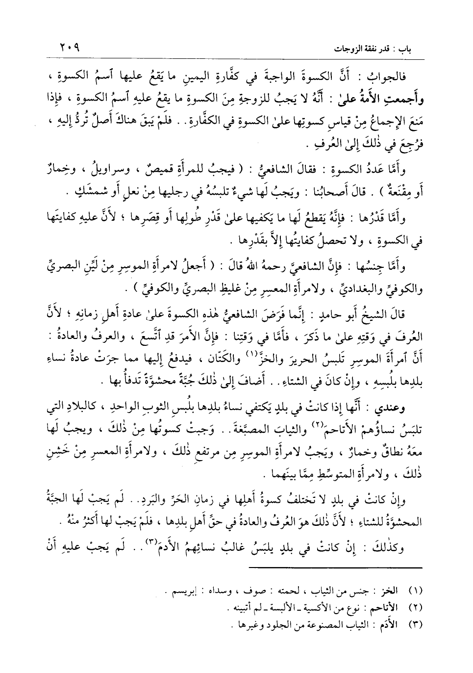 قال الشيخ أبو حامد: إنما فرض الشافعي هذه الكسوة على عادة أهل زمانه؛ لأن العرف في وقته على ما ذكر، فأما في وقتنا: فإن الأمر قد اتسع، والعرف والعادة: أن امرأة الموسر تلبس الحرير والخز والكتان، فيدفع إليها مما جرت عادة نساء بلدها بلبسه، وإن كان في الشتاء.. أضاف إلى ذلك جبة محشوة تدفأ بها.