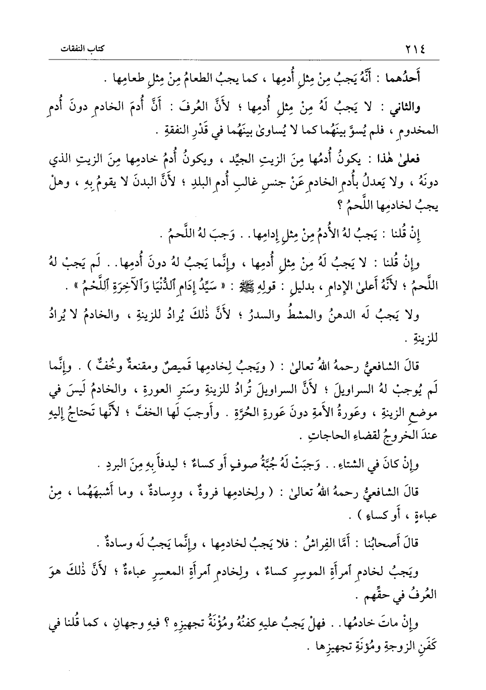 فعلى هذا: يكون أدمها من الزيت الجيد، ويكون أدم خادمها من الزيت الذي دونه، ولا يعدل بأدم الخادم عن جنس غالب أدم البلد؛ لأن البدن لا يقوم به، وهل يجب لخادمها اللحم؟