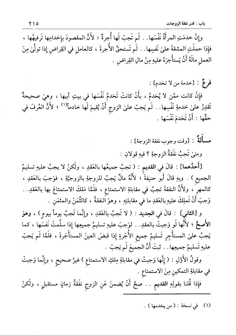 و [الثاني] : قال في الجديد: (لا تجب بالعقد، وإنما تجب يومًا بيوم) ، وهو الأصح؛ لأنها لو وجبت بالعقد.. لوجب عليه تسليم جميعها إذا سلمت نفسها، كما يجب على المستأجر تسليم جميع الأجرة إذا قبض العين المستأجرة، فلما لم يجب عليه تسليم جميعها.. ثبت أن الجميع لم يجب.