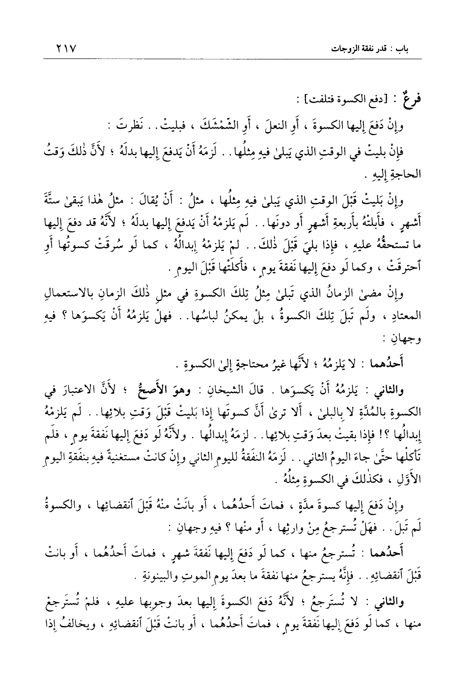 وإن بليت قبل الوقت الذي يبلى فيه مثلها، مثل: أن يقال: مثل هذا يبقى ستة أشهر، فأبلته بأربعة أشهر أو دونها.. لم يلزمه أن يدفع إليها بدله؛ لأنه قد دفع إليها ما تستحقه عليه، فإذا بلي قبل ذلك.. لم يلزمه إبداله، كما لو سرقت كسوتها أو احترقت، وكما لو دفع إليها نفقة يوم، فأكلتها قبل اليوم.