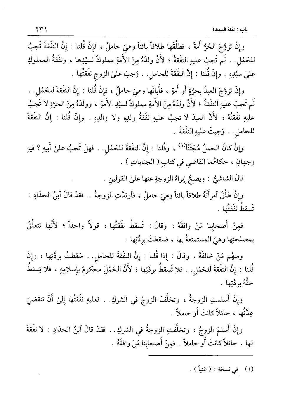 ومنهم من خالفه، وقال: إذا قلنا: إن النفقة للحامل.. سقطت بردتها، وإن قلنا: إن النفقة للحمل.. فلا تسقط بردتها؛ لأن الحمل محكوم بإسلامه، فلا يسقط حقه بردتها.