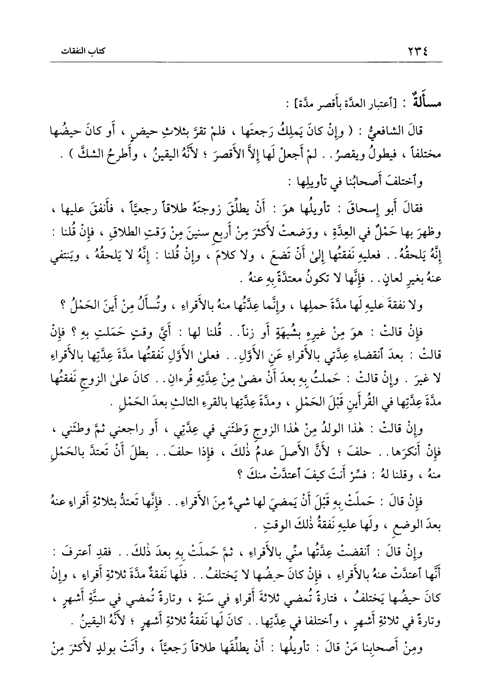 قال الشافعي: (وإن كان يملك رجعتها، فلم تقر بثلاث حيض، أو كان حيضها مختلفًا، فيطول ويقصر.. لم أجعل لها إلا الأقصر؛ لأنه اليقين، وأطرح الشك) .