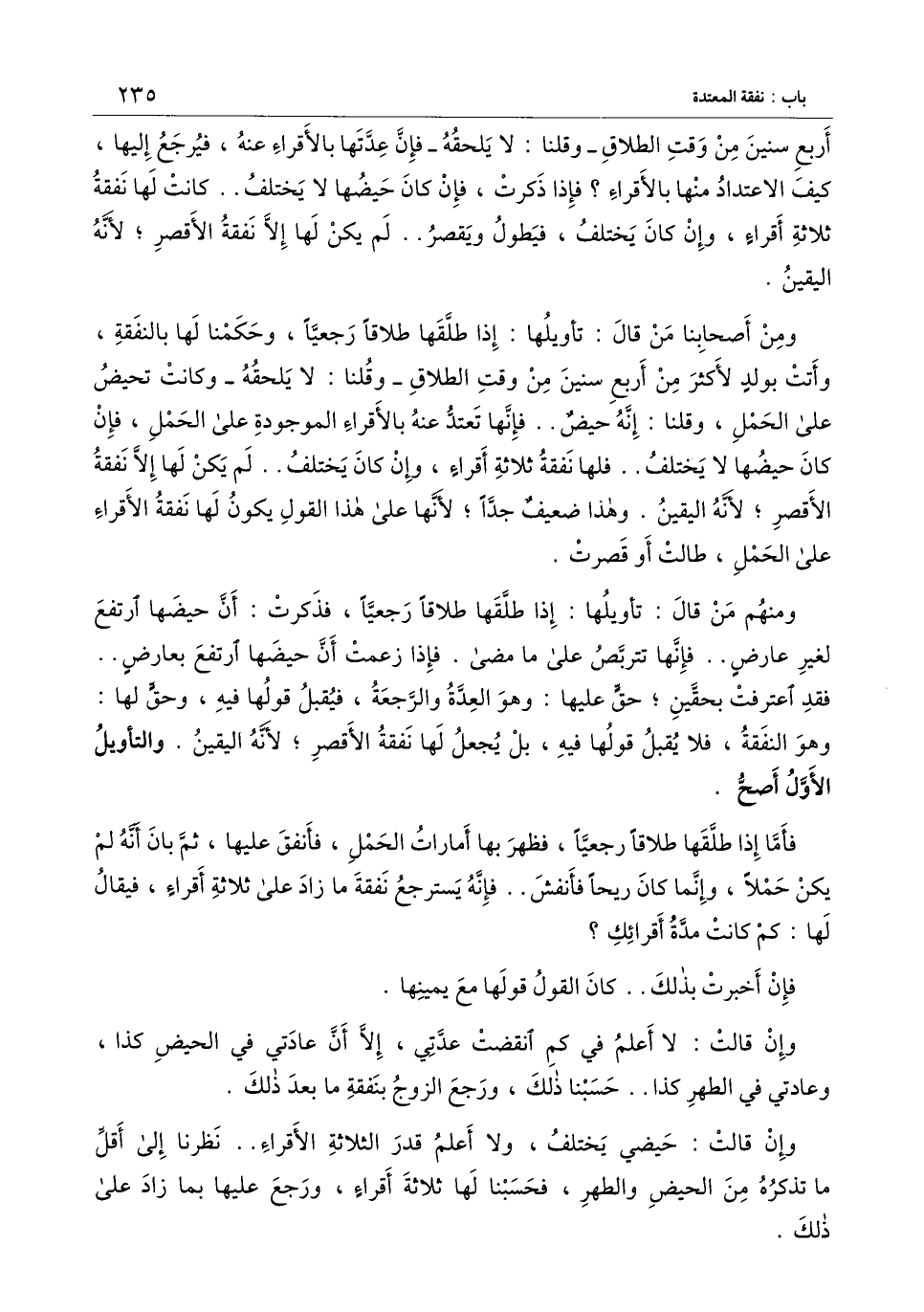 ومن أصحابنا من قال: تأويلها: إذا طلقها طلاقًا رجعيًا، وحكمنا لها بالنفقة، وأتت بولد لأكثر من أربع سنين من وقت الطلاق - وقلنا: لا يلحقه - وكانت تحيض على الحمل، وقلنا: إنه حيض.. فإنها تعتد عنه بالأقراء الموجودة على الحمل، فإن كان حيضها لا يختلف.. فلها نفقة ثلاثة أقراء، وإن كان يختلف.. لم يكن لها إلا نفقة الأقصر؛ لأنه اليقين. وهذا ضعيف جدًا؛ لأنها على هذا القول يكون لها نفقة الأقراء على الحمل، طالت أو قصرت.