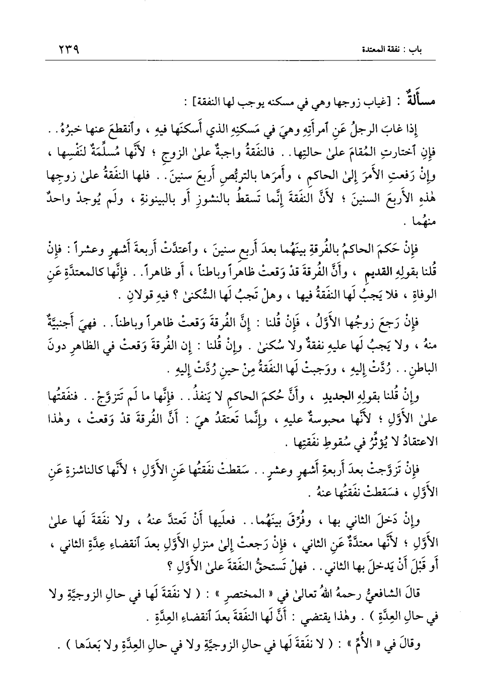 ] : إذا غاب الرجل عن امرأته وهي في مسكنه الذي أسكنها فيه، وانقطع عنها خبره.. فإن اختارت المقام على حالتها.. فالنفقة واجبة على الزوج؛ لأنها مسلمة لنفسها، وإن رفعت الأمر إلى الحاكم، وأمرها بالتربص أربع سنين.. فلها النفقة على زوجها هذه الأربع السنين؛ لأن النفقة إنما تسقط بالنشوز أو بالبينونة، ولم يوجد واحد منهما.