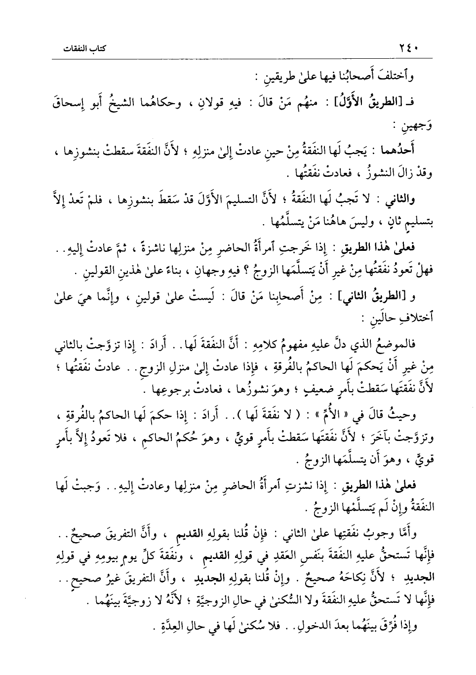 فعلى هذا الطريق: إذا نشزت امرأة الحاضر من منزلها وعادت إليه.. وجبت لها النفقة وإن لم يتسلمها الزوج.
