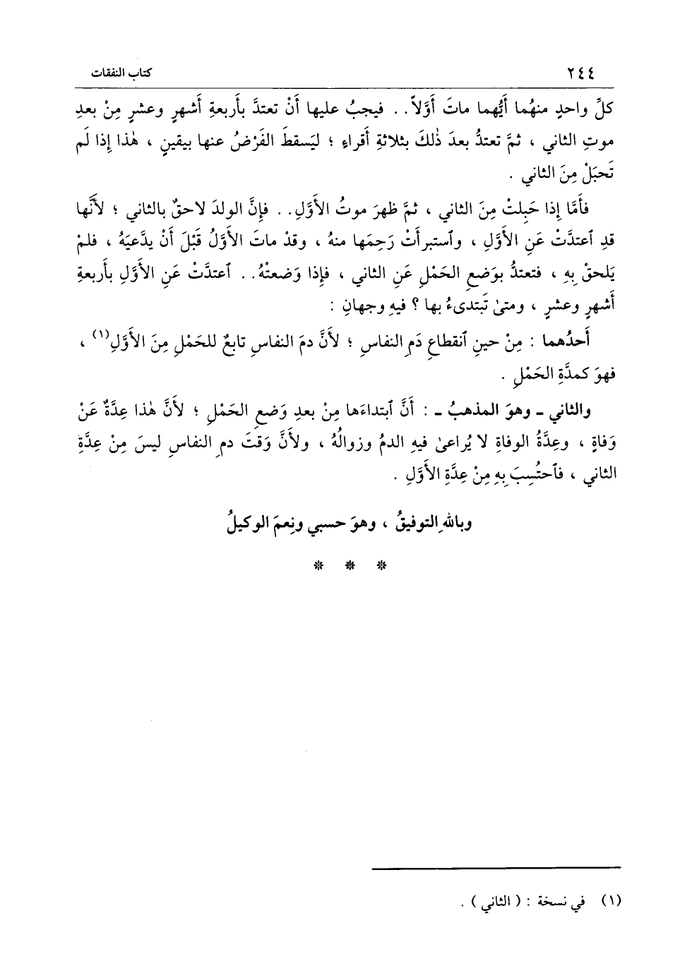 والثاني - وهو المذهب -: أن ابتداءها من بعد وضع الحمل؛ لأن هذا عدة عن وفاة، وعدة الوفاة لا يراعى فيه الدم وزواله، ولأن وقت دم النفاس ليس من عدة الثاني، فاحتسب به من عدة الأول.