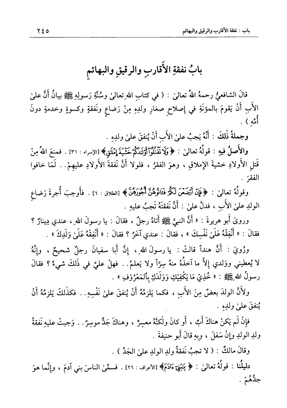 قال الشافعي - رَحِمَهُ اللَّهُ تَعَالَى -: (في كتاب الله تعالى وسنة رسوله - صَلَّى اللَّهُ عَلَيْهِ وَسَلَّمَ - بيان أن على الأب أن يقوم بالمؤنة في إصلاح صغار ولده من رضاع ونفقة وكسوة وخدمة دون أمه) .