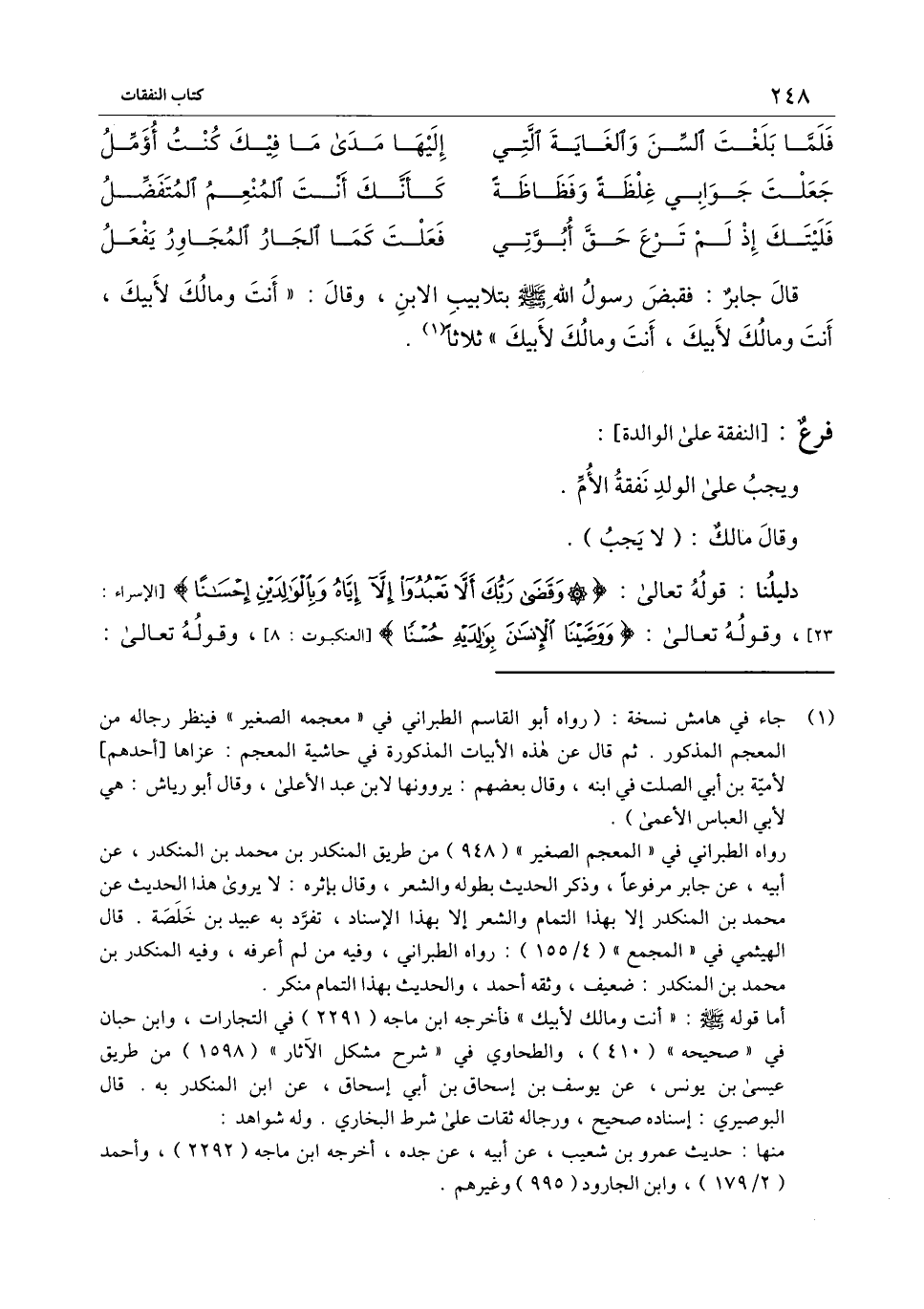 قال جابر: فقبض رسول الله - صَلَّى اللَّهُ عَلَيْهِ وَسَلَّمَ - بتلابيب الابن، وقال: " أنت ومالك لأبيك، أنت ومالك لأبيك، أنت ومالك لأبيك " ثلاثًا» .