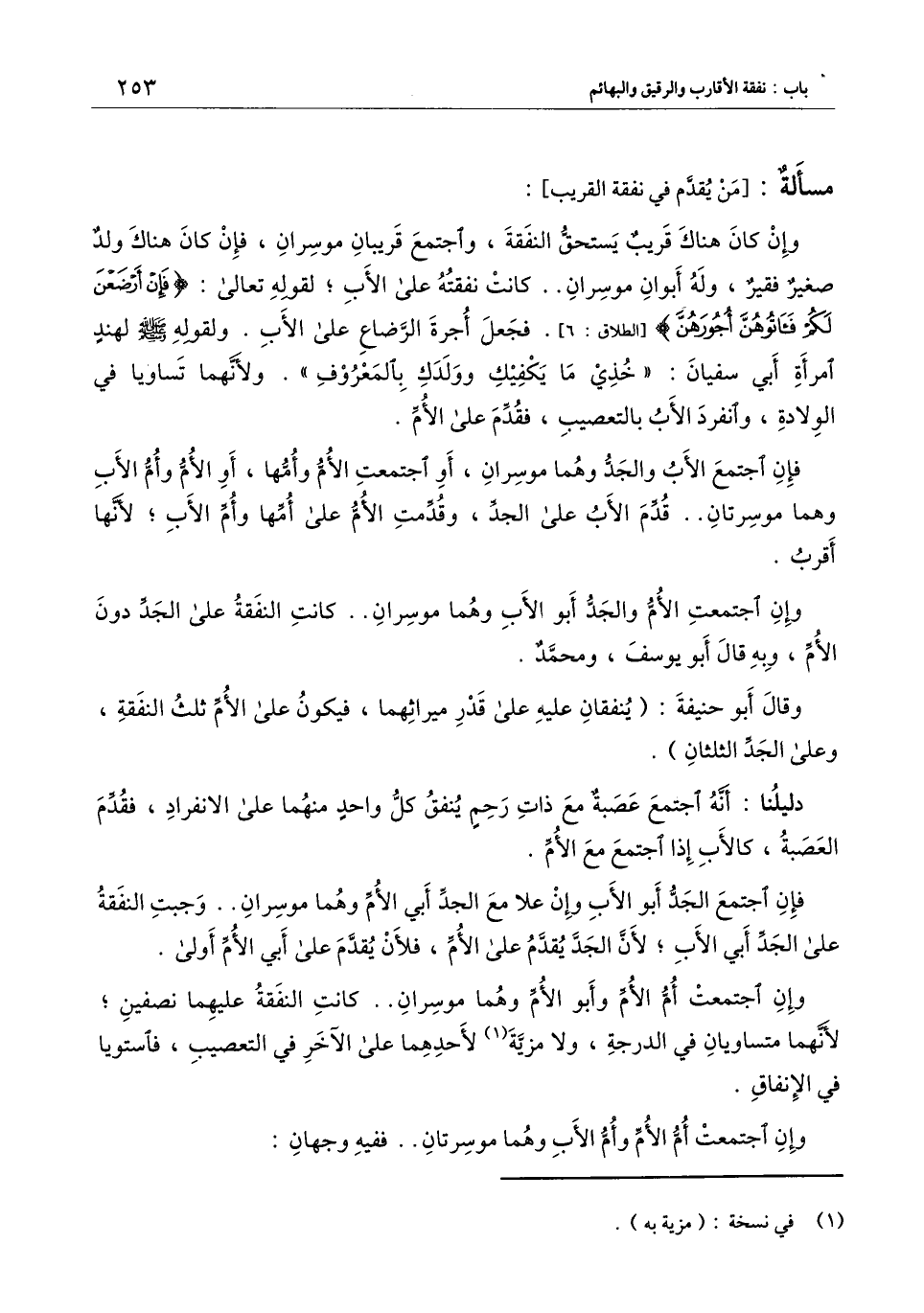 وإن كان هناك قريب يستحق النفقة، واجتمع قريبان موسران، فإن كان هناك ولد صغير فقير، وله أبوان موسران.. كانت نفقته على الأب؛ لِقَوْلِهِ تَعَالَى: {فَإِنْ أَرْضَعْنَ لَكُمْ فَآتُوهُنَّ أُجُورَهُنَّ} [الطلاق: 6] [الطلاق: 6] . فجعل أجرة الرضاع على الأب. ولقوله - صَلَّى اللَّهُ عَلَيْهِ وَسَلَّمَ - لهند امرأة أبي سفيان: «خذي ما يكفيك وولدك بالمعروف» ولأنهما تساويا في الولادة، وانفرد الأب بالتعصيب، فقدم على الأم.
