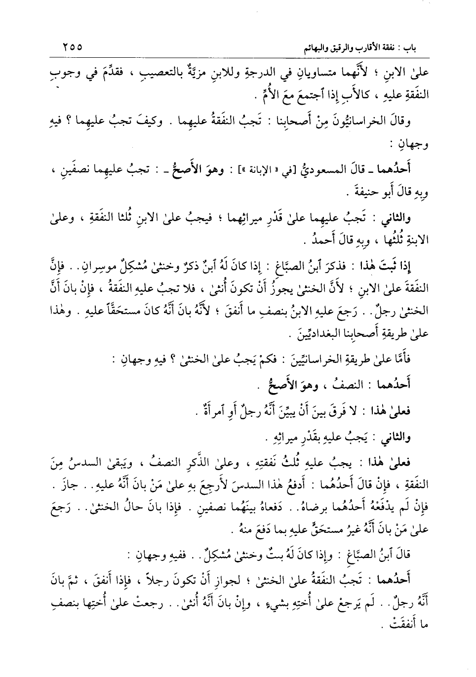 إذا ثبت هذا: فذكر ابن الصباغ: إذا كان له ابن ذكر وخنثى مشكل موسران.. فإن النفقة على الابن؛ لأن الخنثى يجوز أن تكون أنثى، فلا تجب عليه النفقة، فإن بان أن الخنثى رجل.. رجع عليه الابن بنصف ما أنفق؛ لأنه بان أنه كان مستحقًا عليه. وهذا على طريقة أصحابنا البغداديين.