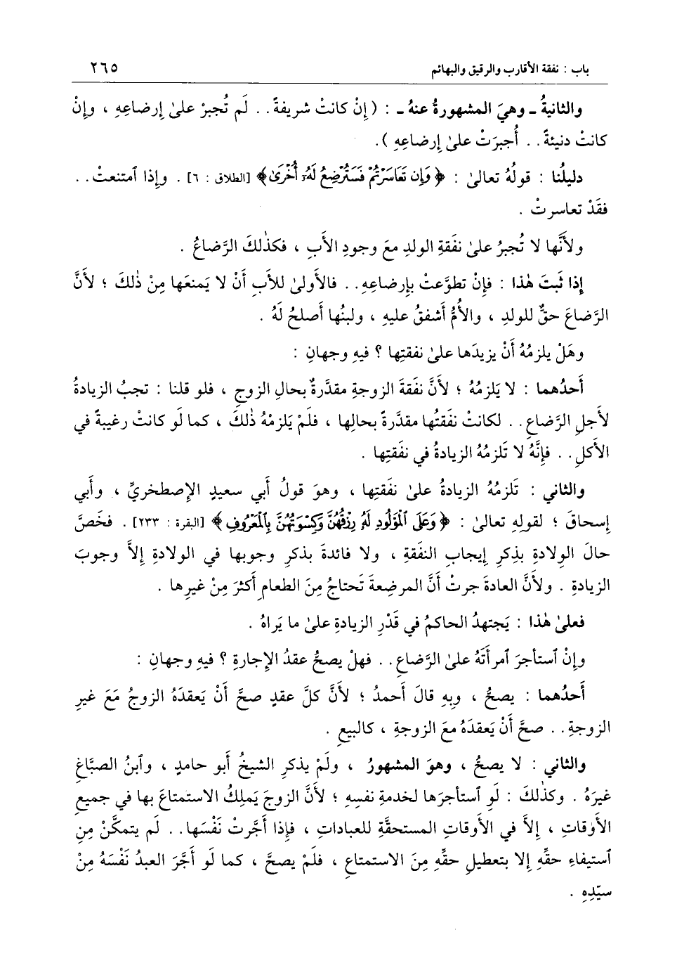 والثاني: تلزمه الزيادة على نفقتها، وهو قول أبي سعيد الإصطخري، وأبي إسحاق؛ لِقَوْلِهِ تَعَالَى: {وَعَلَى الْمَوْلُودِ لَهُ رِزْقُهُنَّ وَكِسْوَتُهُنَّ بِالْمَعْرُوفِ} [البقرة: 233] [البقرة: 233] فخص حال الولادة بذكر إيجاب النفقة، ولا فائدة بذكر وجوبها في الولادة إلا وجوب الزيادة. ولأن العادة جرت أن المرضعة تحتاج من الطعام أكثر من غيرها.