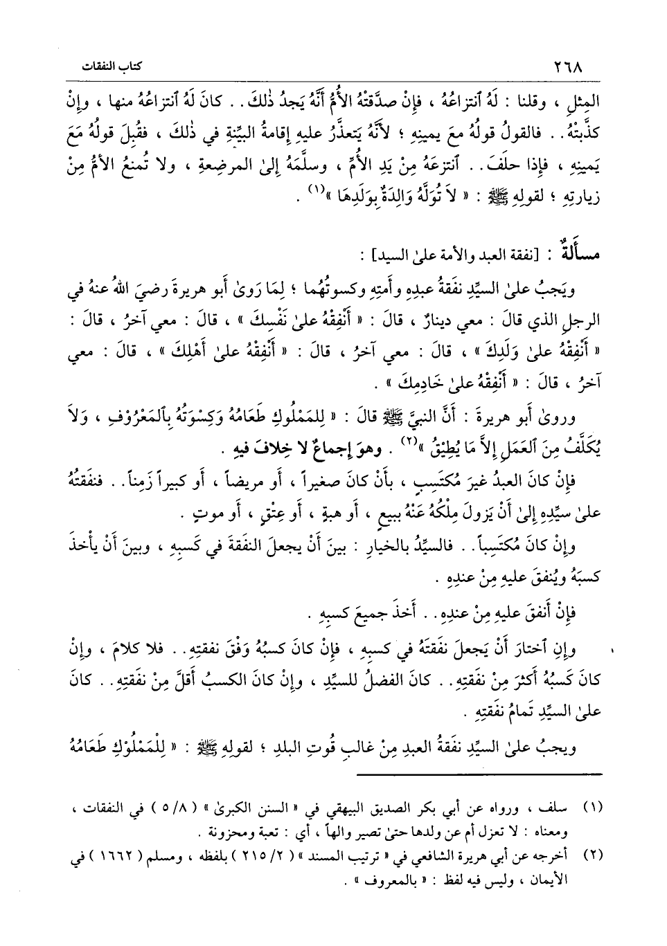 ويجب على السيد نفقة عبده وأمته وكسوتهما؛ لما «روى أبو هريرة - رَضِيَ اللَّهُ عَنْهُ - في الرجل الذي قال: معي دينار، قال: " أنفقه على نفسك "، قال: معي آخر، قال: " أنفقه على ولدك "، قال: معي آخر، قال: " أنفقه على أهلك "، قال: معي آخر، قال: " أنفقه على خادمك» .